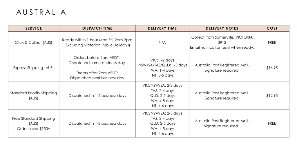 Please note that the shipping times below are estimates only. For a more accurate delivery timeframe to your location, we recommend entering your postcode into the Australia Post Transit Calculator. Please also note that orders are not processed on weekends or public holidays.