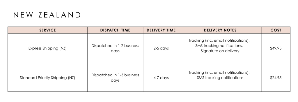 NZ orders dispatch within 1–2 business days with Express or 1–3 business days with Standard Shipping.