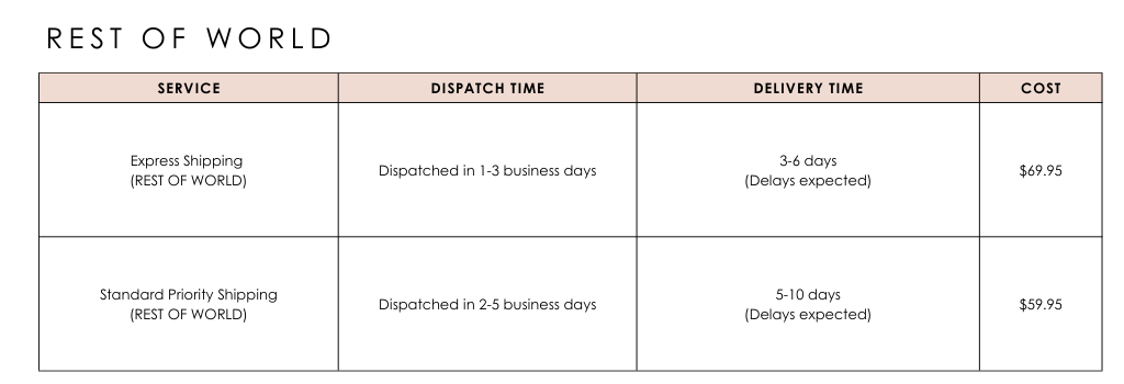 International orders dispatch within 1–3 business days with Express or 2-5 business days with Standard Shipping.