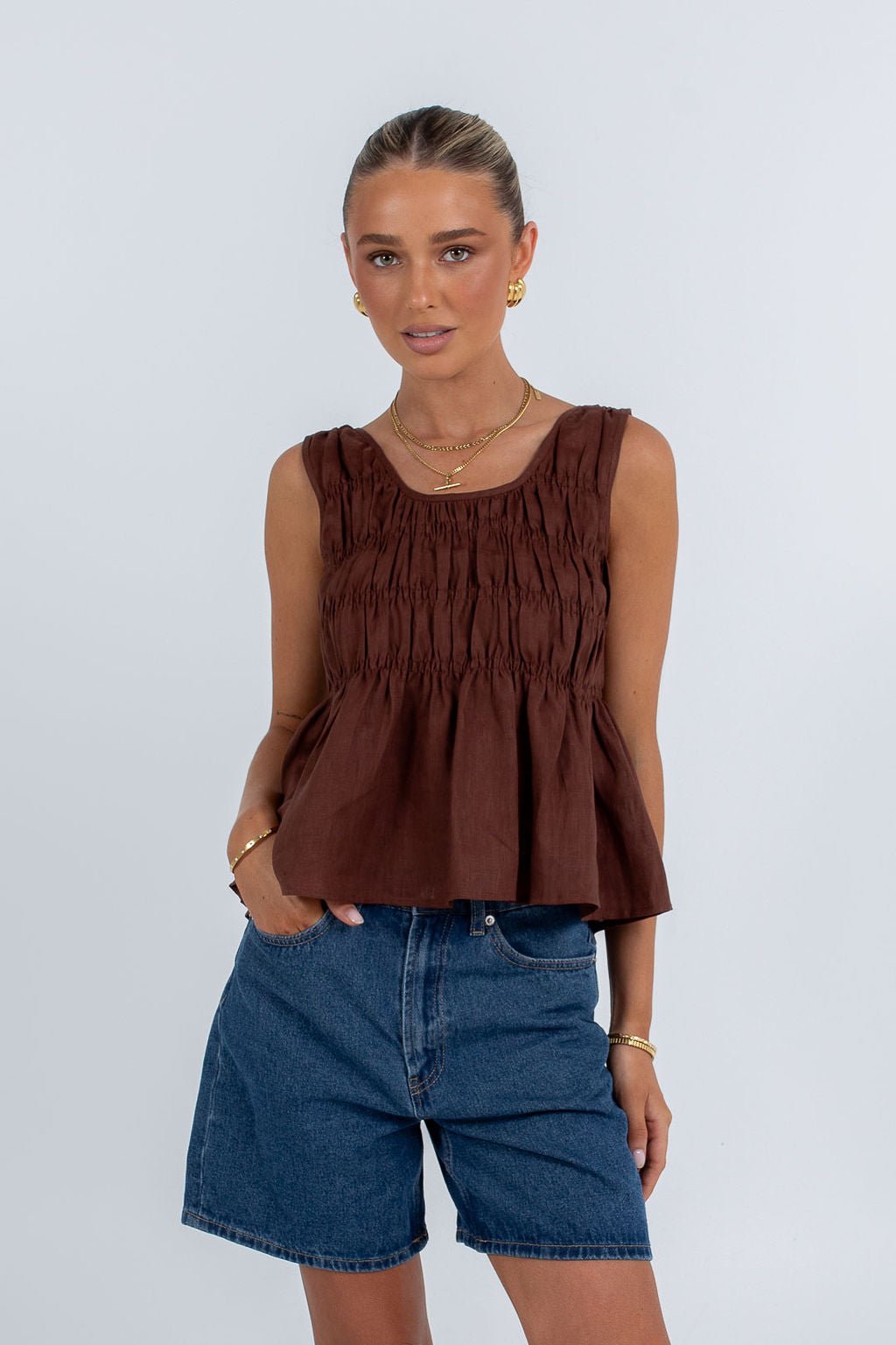 The Alegra Top in chocolate features ribbed elastic detailing through the bodice with a classic round neckline. Designed in an A-line silhouette and cropped length, it offers a flattering, comfortable fit that’s easy to style for everyday wear or all