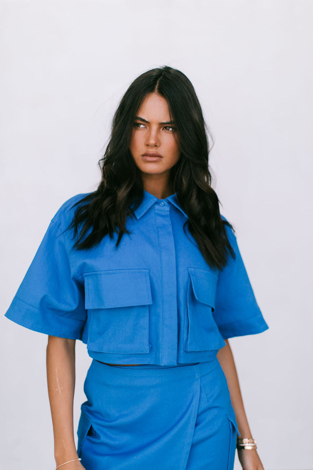 Make a statement in Apella. Her boxy, relaxed silhouette boasts utility-style edge. Finished with fabric-covered buttons for a polished touch, it's the perfect blend of structure + effortless cool. Pair with the Valtos Skirt for the ultimate combo.
