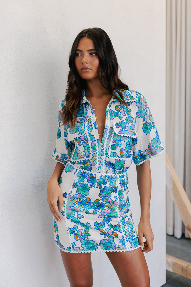 Blend elegance + charm in our exclusive Aprire Mini Skirt by BAIA. Boasting one of our best-selling, exclusive bold Cobalt Floral print, she styles effortlessly into your wardrobe. Style as a set with our matching Carina Shirt or our Plyrie Top.