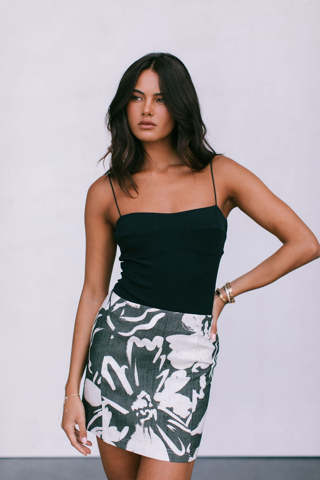 Blend elegance + playfulness in our exclusive Aprire Mini Skirt by BAIA. Boasting an exclusive painterly floral print in natural + charcoal hues, she styles effortlessly into your wardrobe. Style with our matching Fresco Halter Top for a matching set