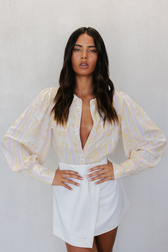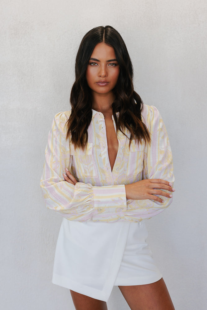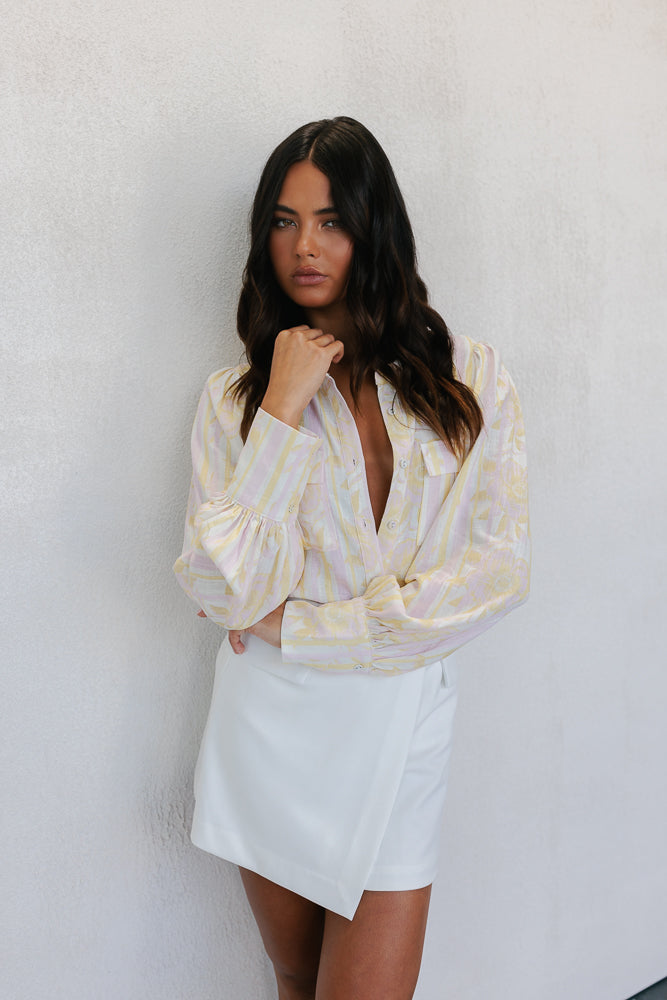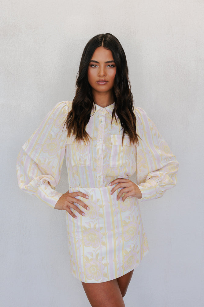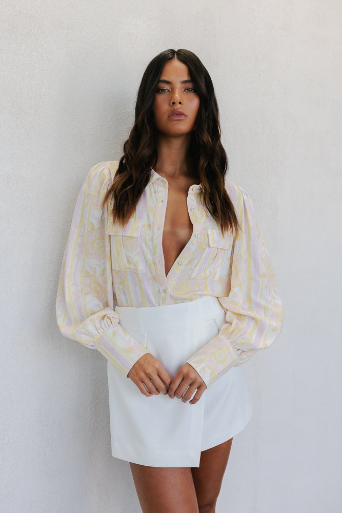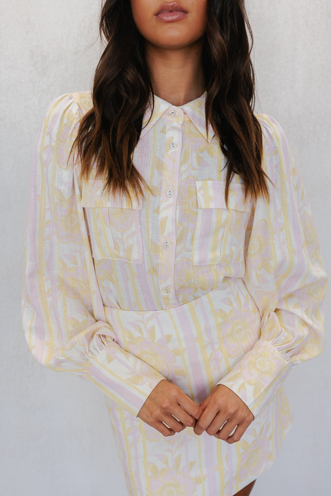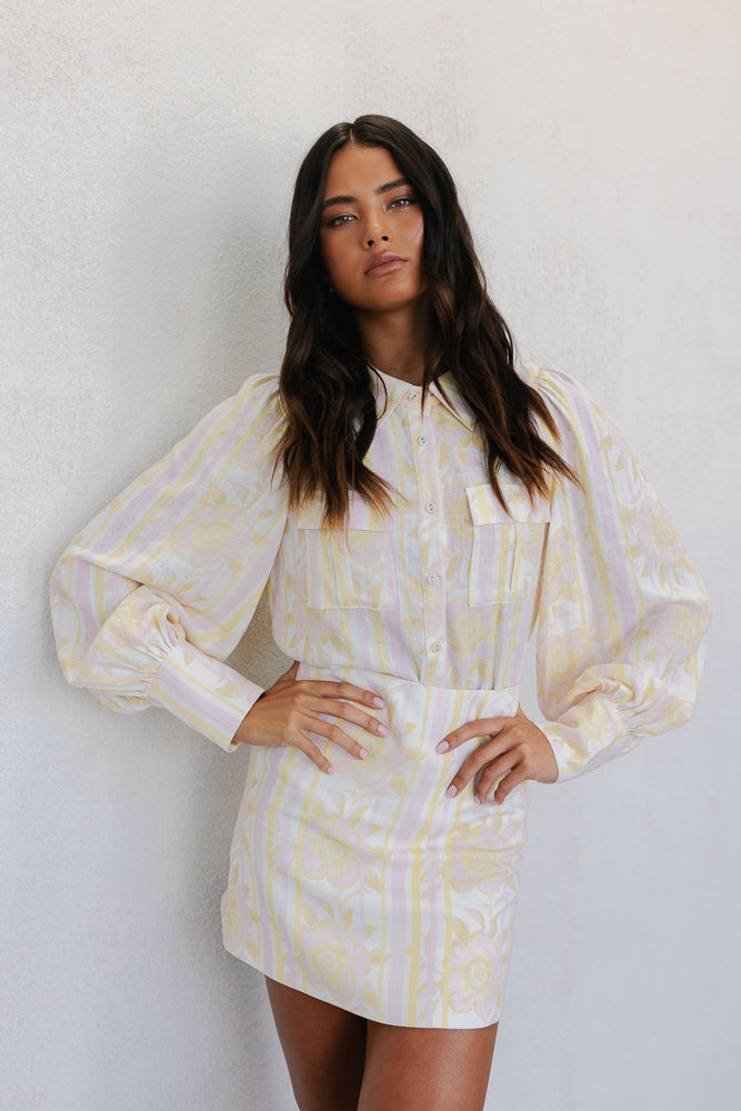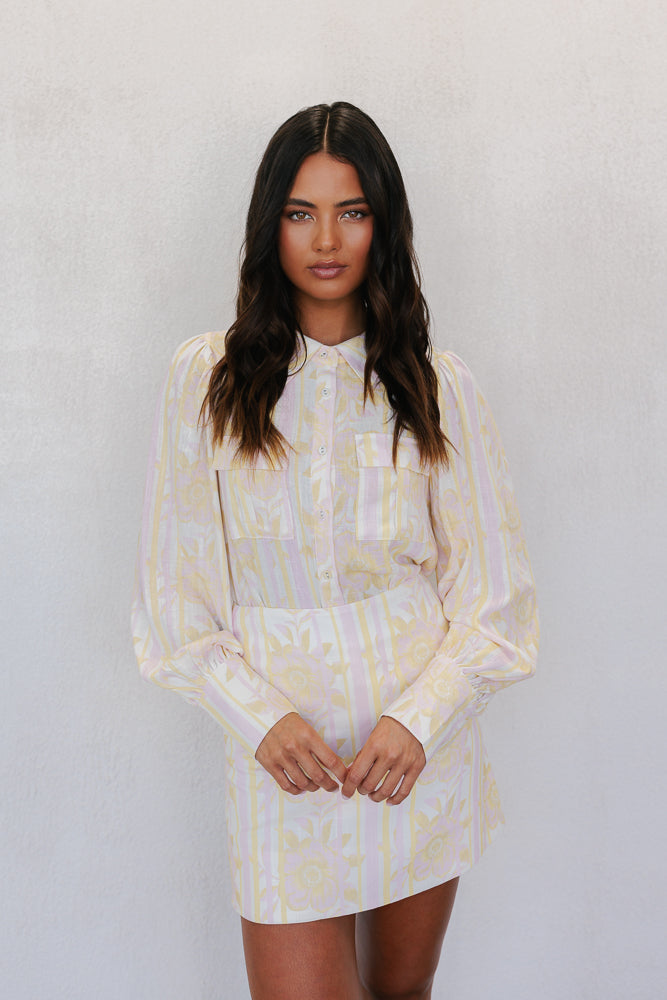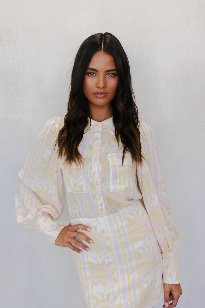 Meet Bailee, a sweet lemon + pink floral shirt offering effortless charm with her relaxed silhouette + beautiful billowed sleeves. A fresh, versatile piece to style back with denim or style as a matching ensemble with our Urissa Skirt.