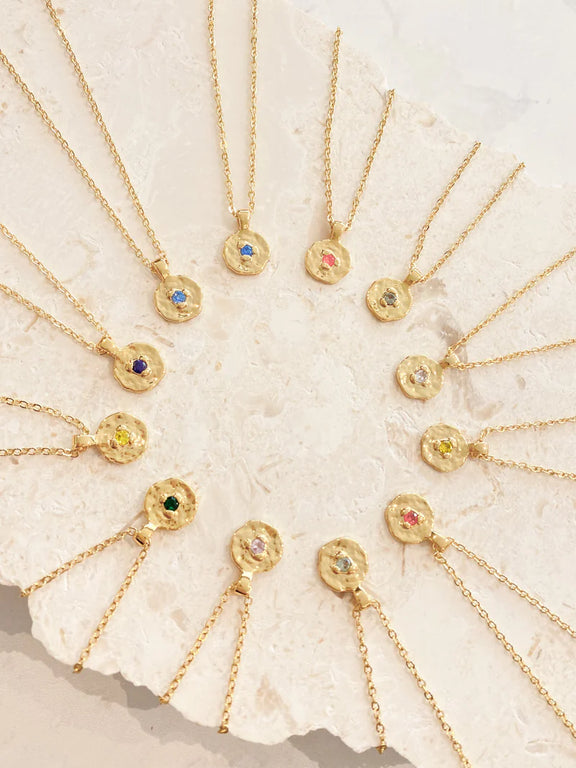 Our Birthstone Necklaces feature a fine gold plated chain + sweet hammered finish, round pendent with correlating month's birthstone.