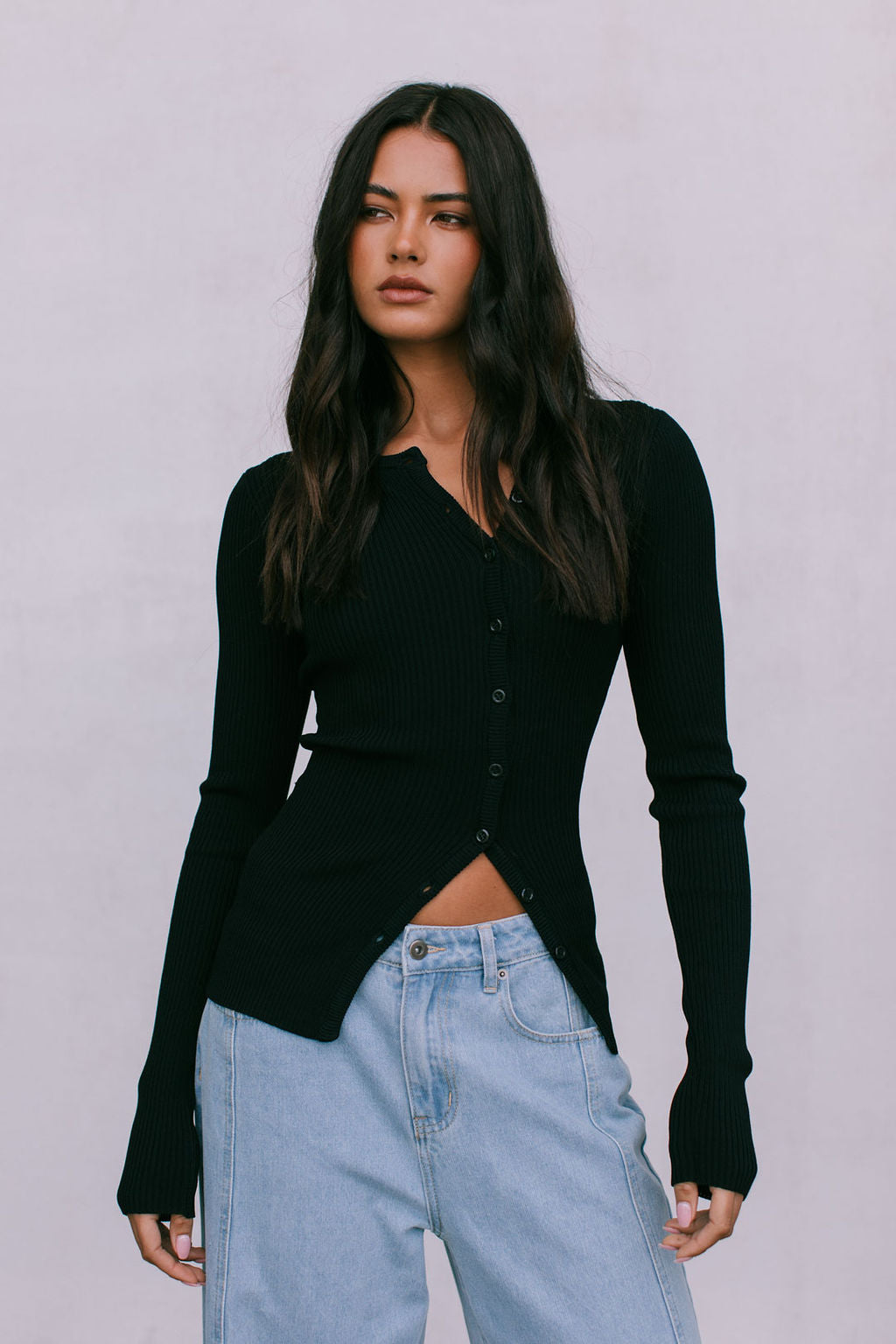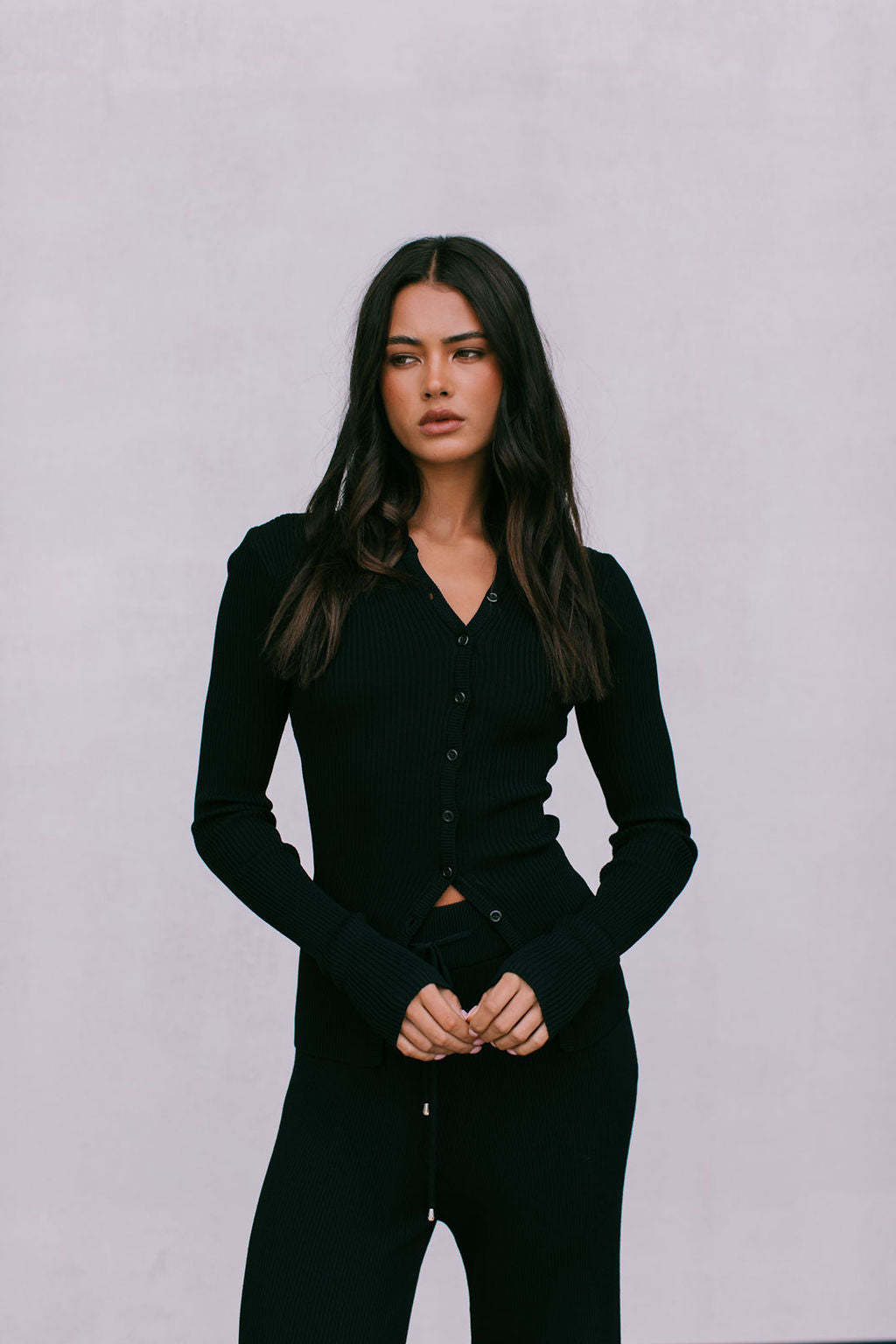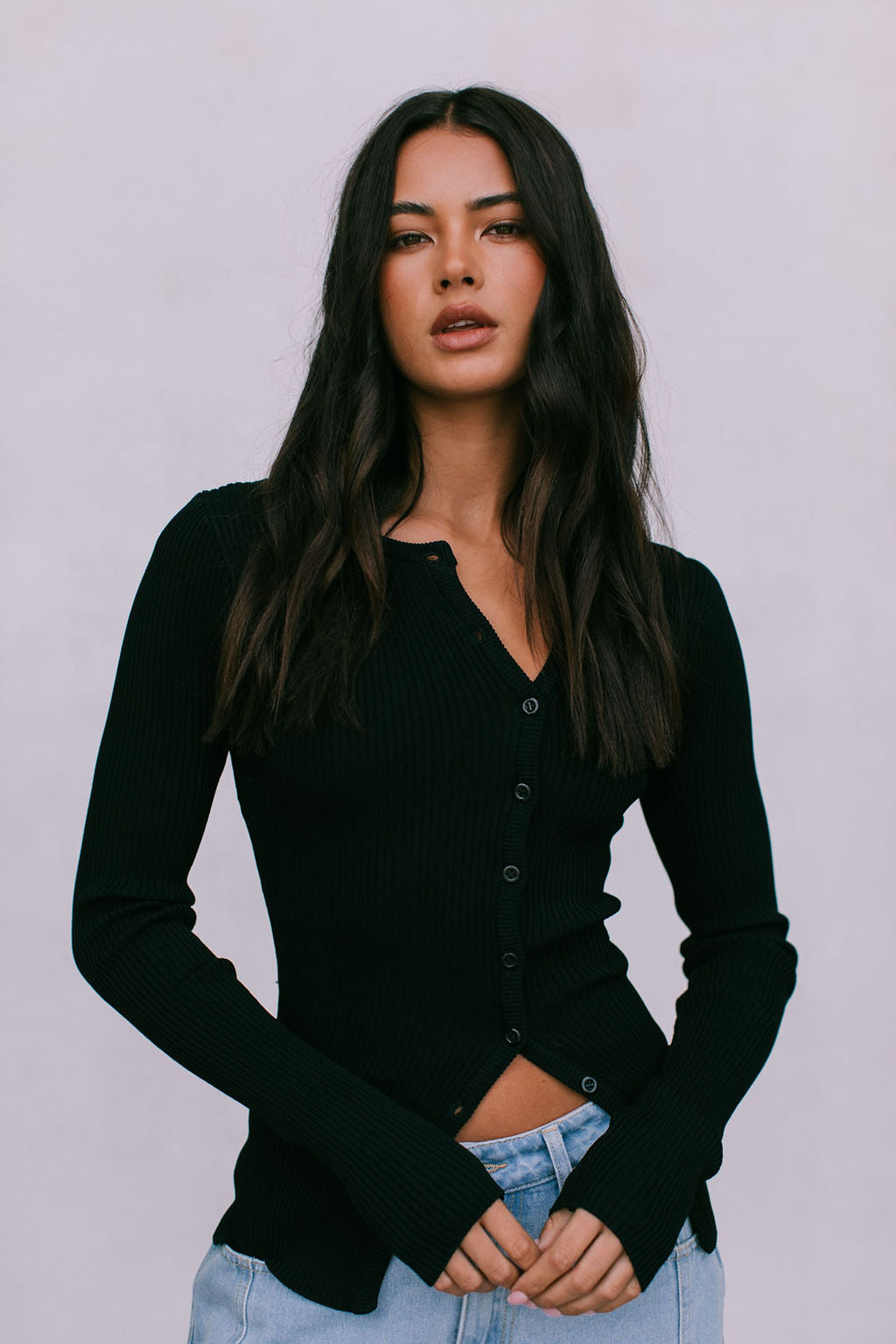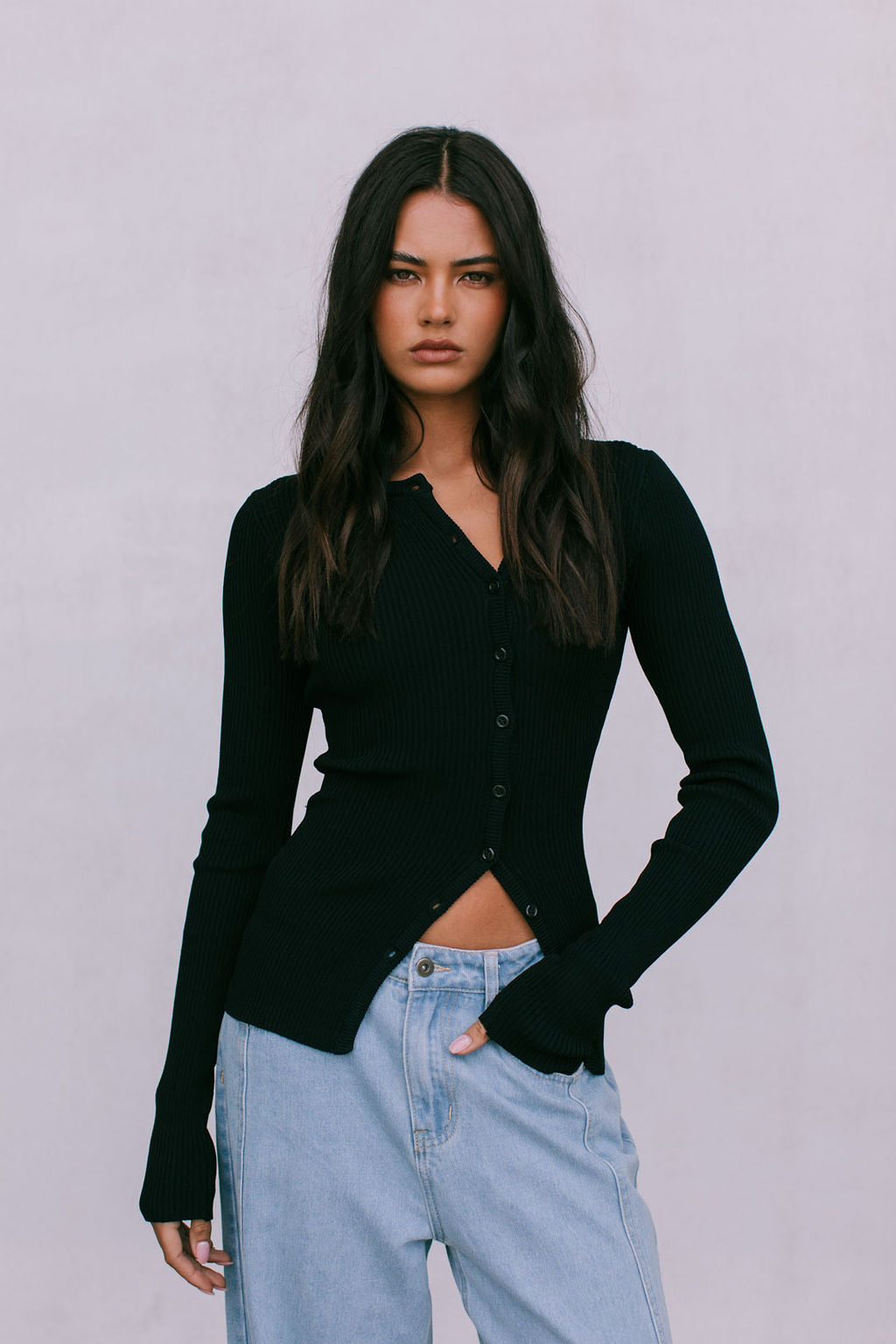 Meet our Brianna Knit Top, the ultimate capsule piece to add into your autumn-winter wardrobe. Her soft ribbed knit, fitted silhouette + a flirty adjustable, asymmetrical button front styles well with denim or as a set with our Jolene Knit Pants.