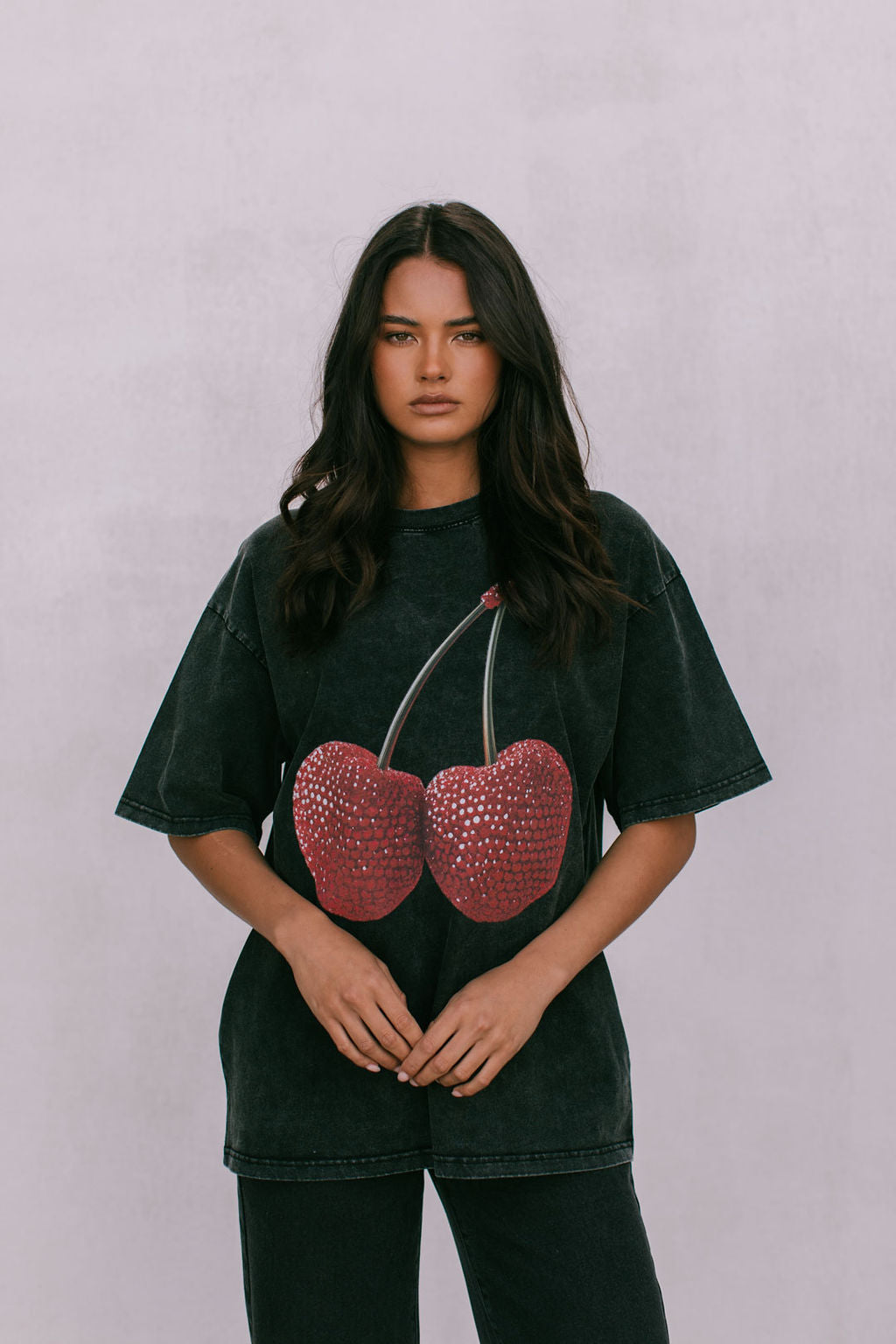 Our Cherry Baby Tee boasts edgy style with a trending cherry graphic on a laid-back oversized, relaxed fit. We love styled back with denim for weekend coffee's with the girls or with a silk midi for Casual Friday's in the office.