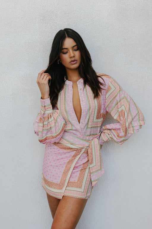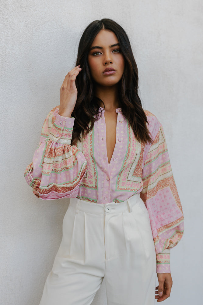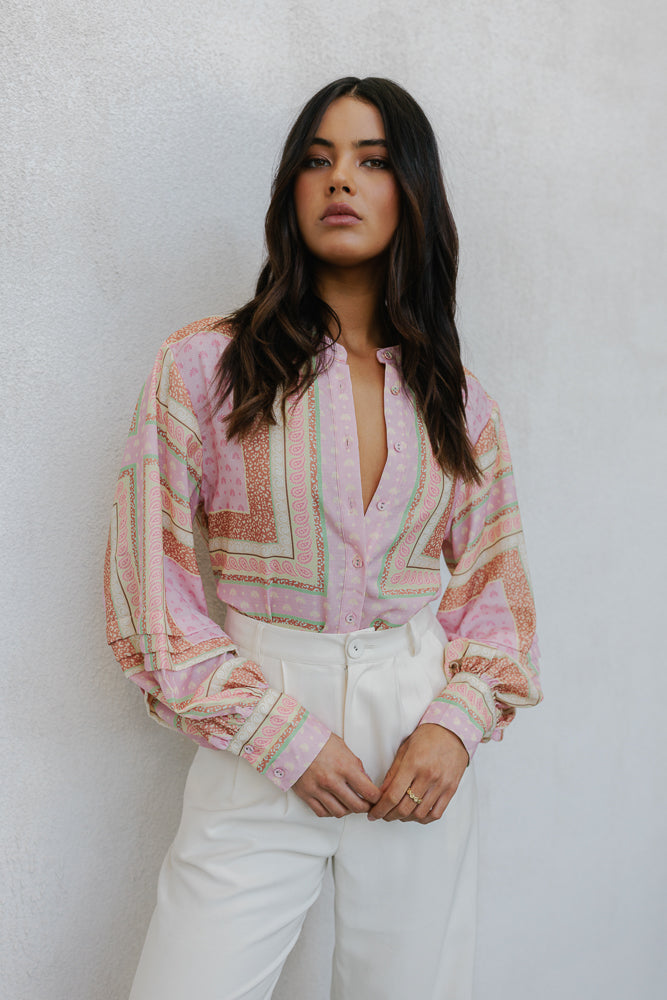 Exclusive to MMB, our Chicago Billowed Shirt by Cinque brings romantic charm to your wardrobe with her feminine geometric print. Boasting billowed sleeves + tiered details, style with denim or paired with our Vigo Skirt for a matching set.