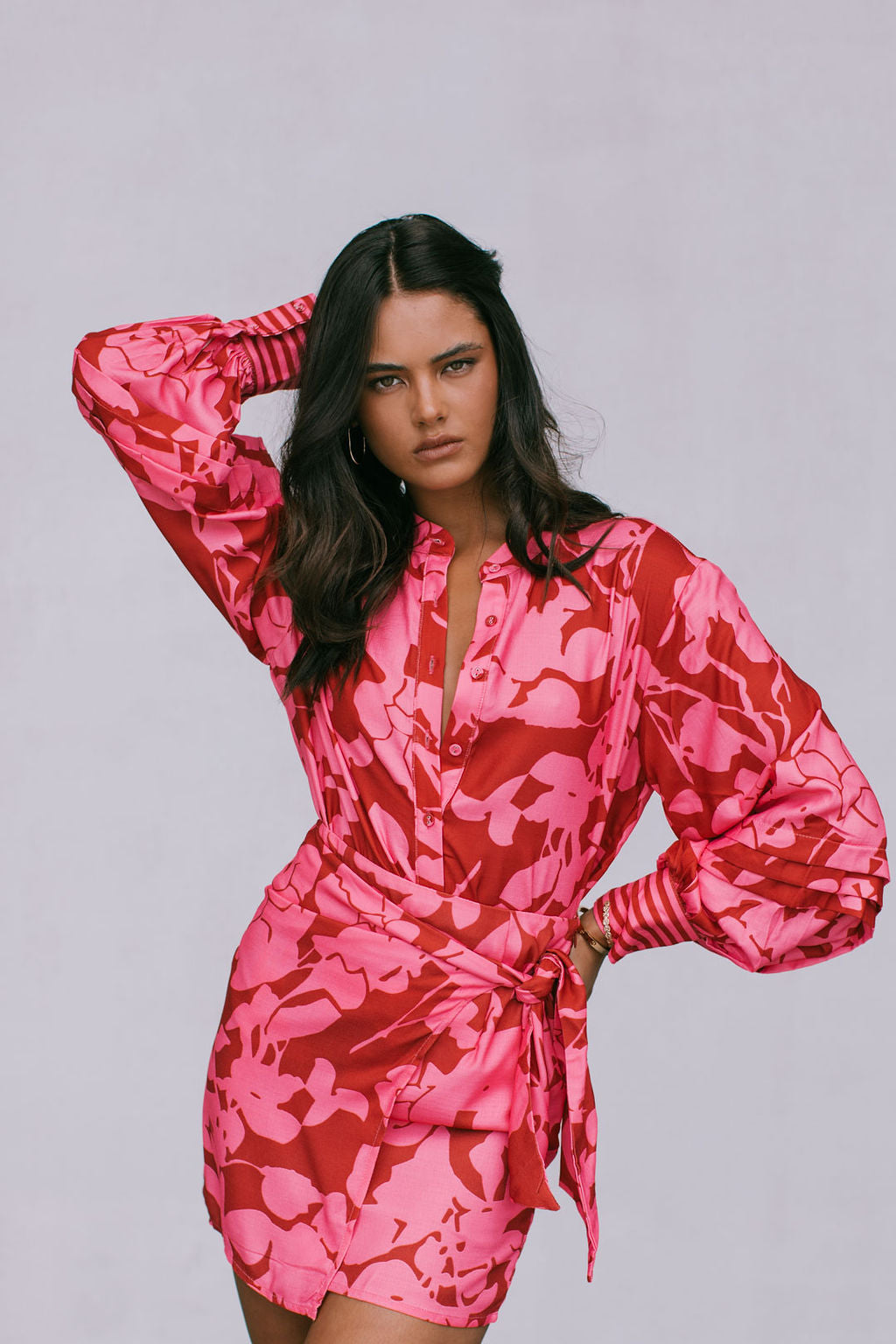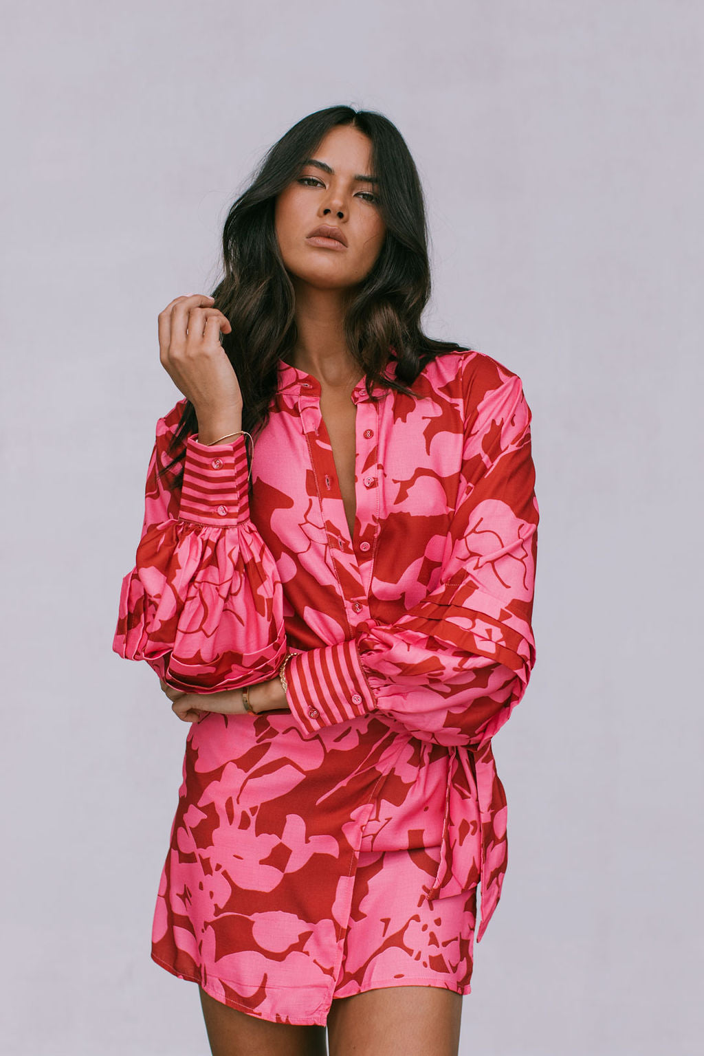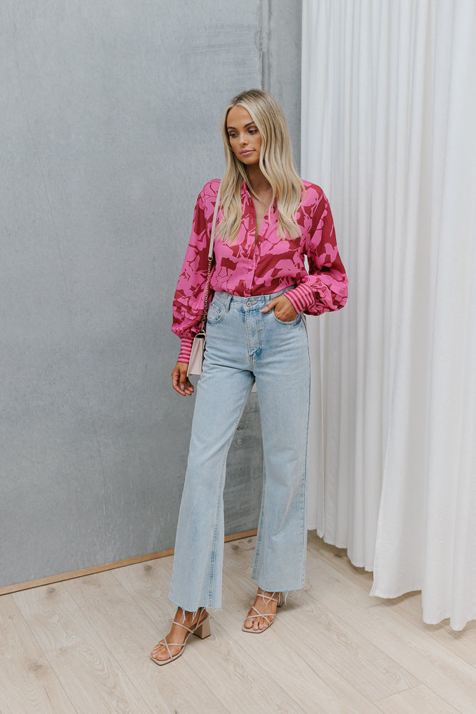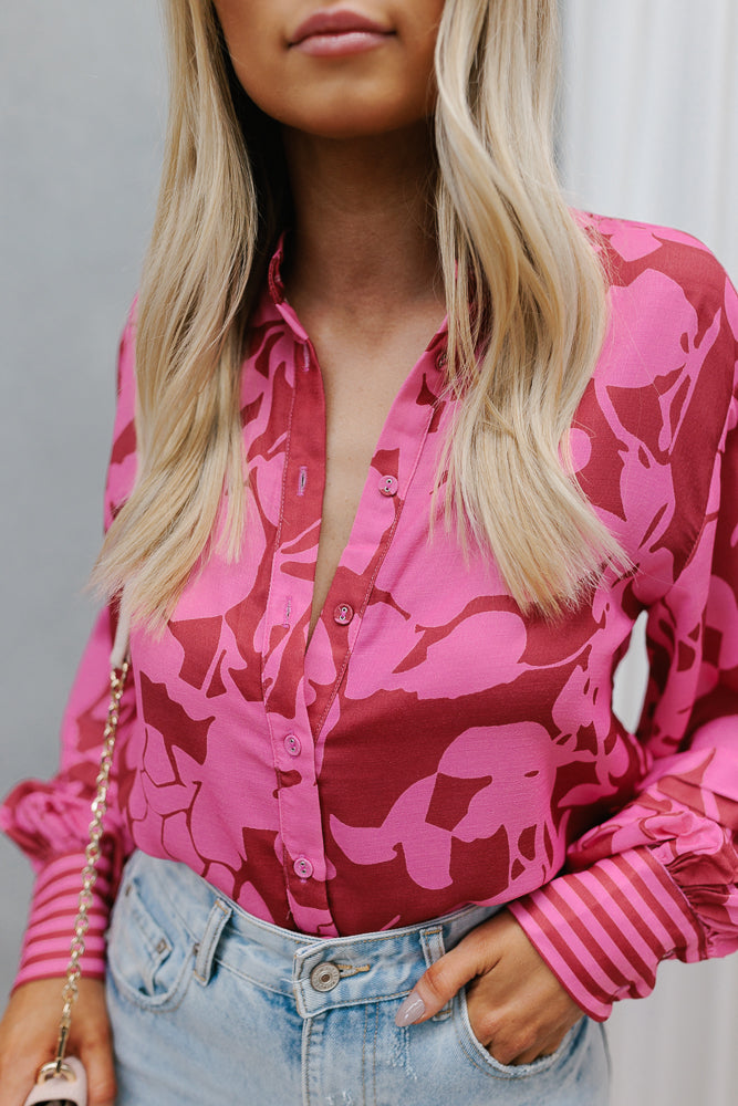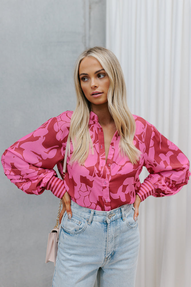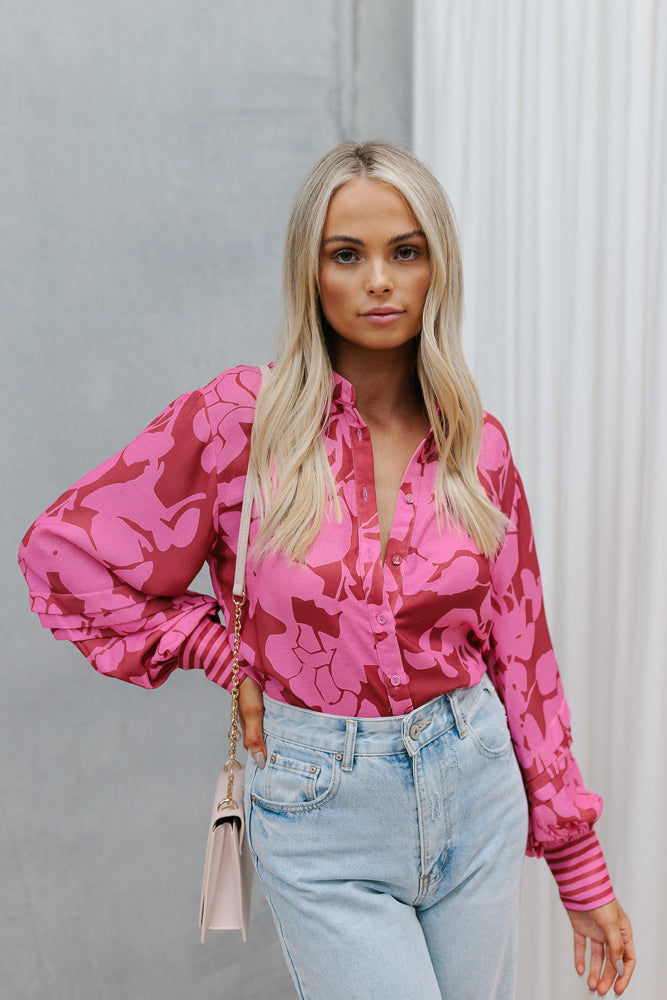 Exclusive to MMB, our Chicago Billowed Shirt by Cinque brings romantic charm to your wardrobe with her plum + candy pink floral print. Boasting billowed sleeves + tiered details, style with denim or paired with our Vigo Skirt for a matching set