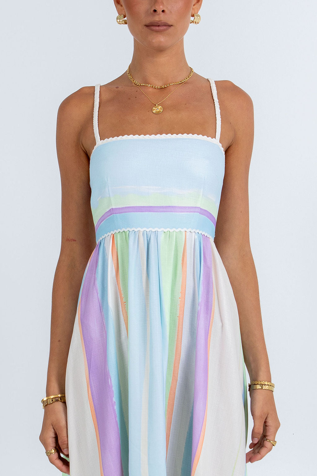 Stunning flowy maxi dress. Exclusive to Cinque, this striking pastel watercolour stripe features soft blue, lilac + mint hues on a lightweight fabrication.