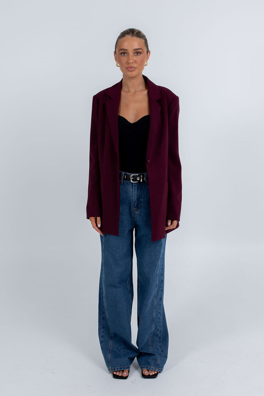 Elevate your style in our Quade Blazer, exclusive to MMB. This relaxed tailored blazer boasts burgundy + luxe details. Versatile to wear solo or perfectly paired with our Jolie Mini Skirt for work to weekend drinks.