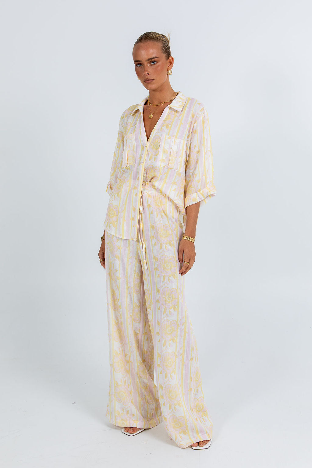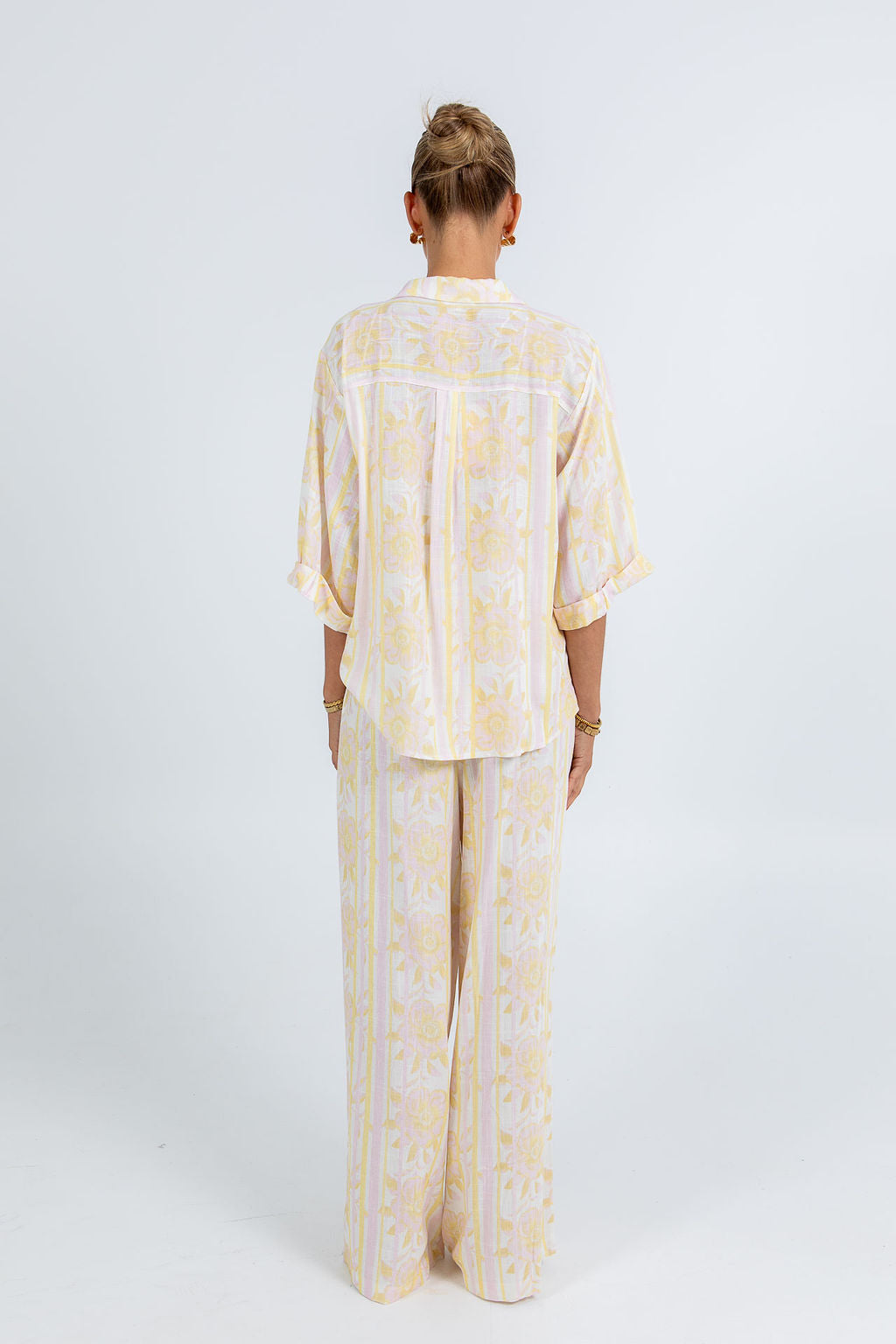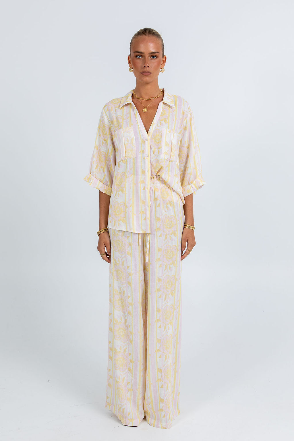 Elevate your wardrobe in our exclusive Delia Set by Tulua. Designed for effortless sophistication. Her relaxed shirt boasts a flattering v-neckline + folded short sleeves, that pairs with wide-leg pants. Perfect for laid-back days or chic outings..