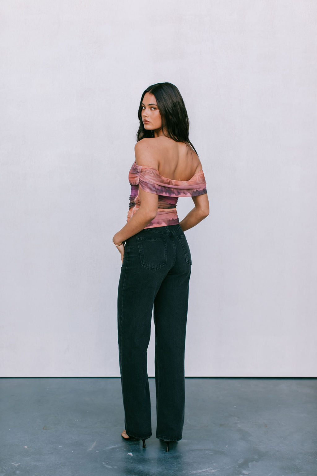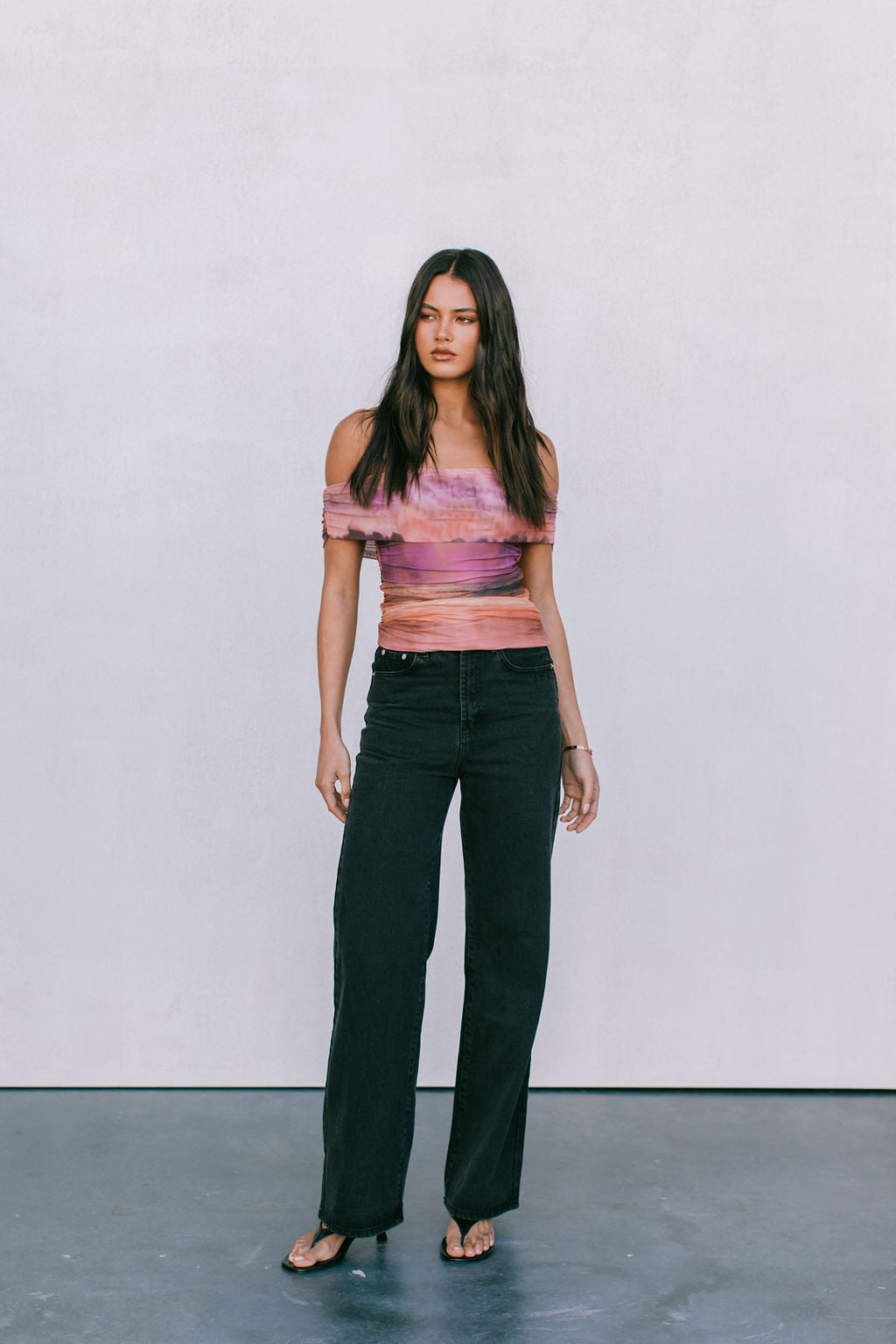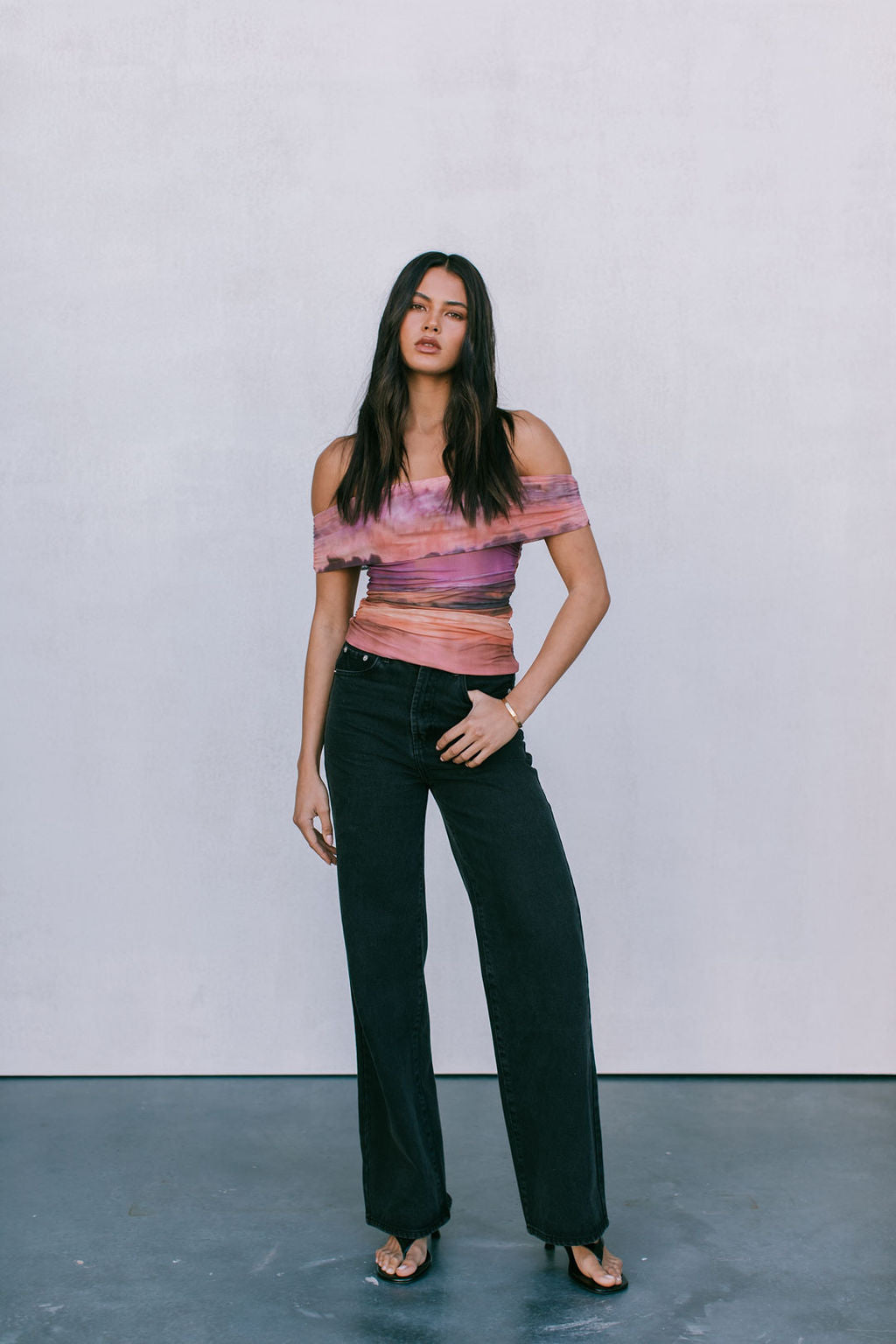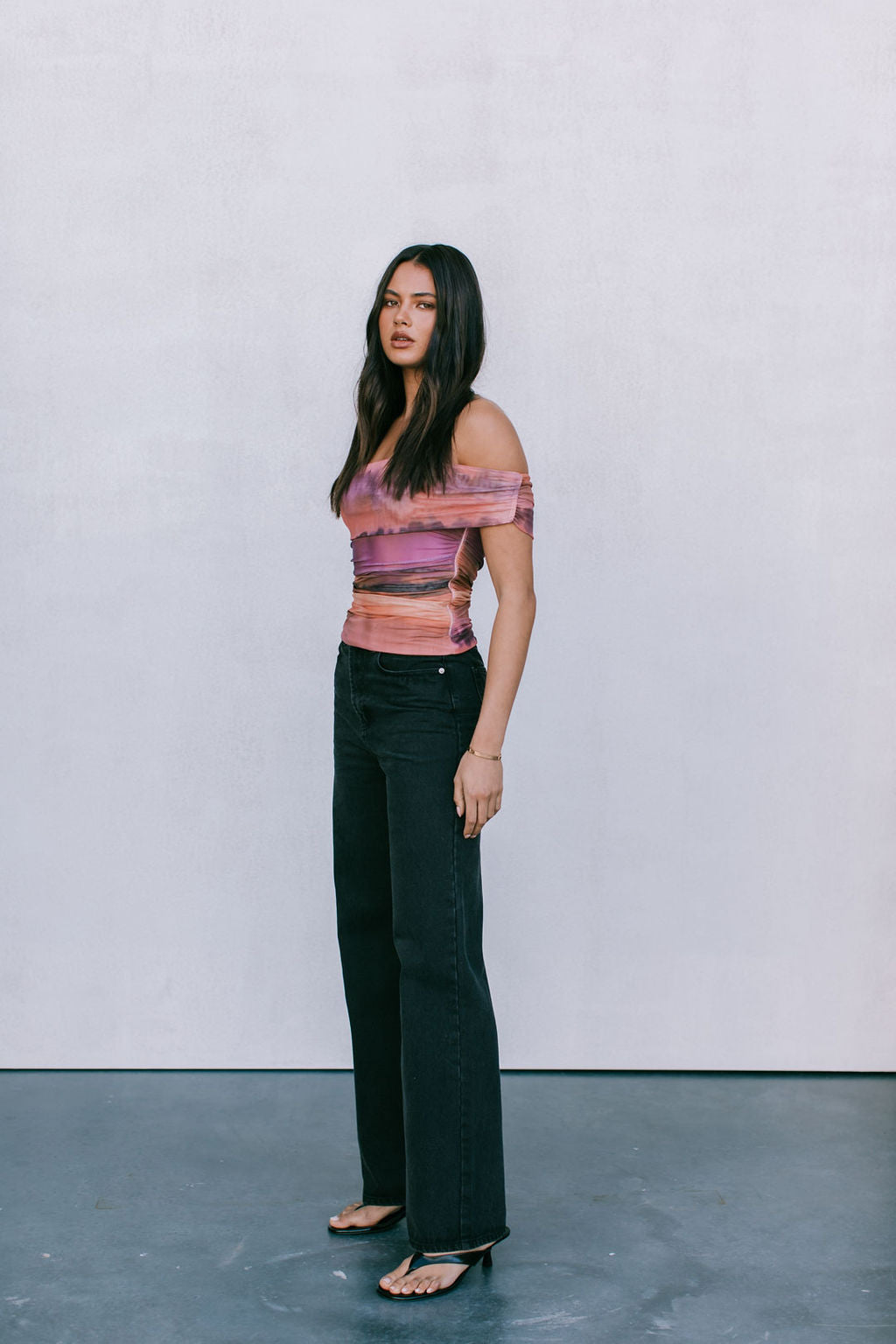 Say hello to our Dolly Off-Shoulder Top by Rosie, a figure-hugging off-shoulder moment in an exclusive desert haze printed mesh in a palette of purple, rust + peach. She’s a go-to for nights out, summer parties or styled back with denim.