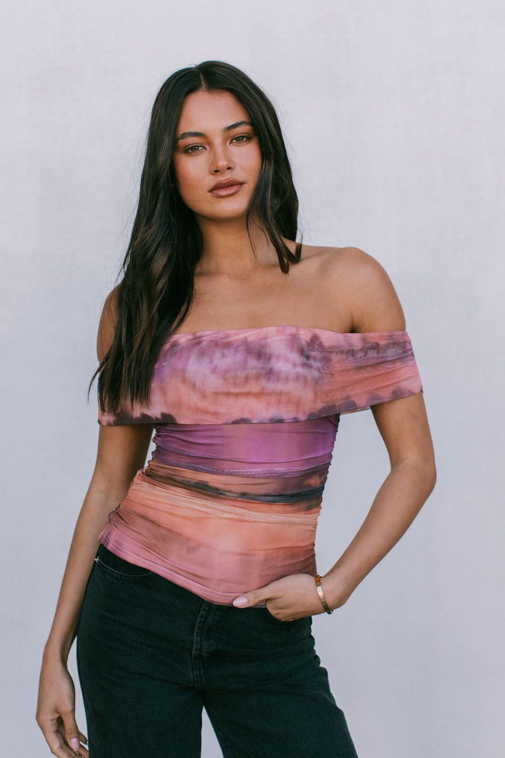 Trending desert haze printed mesh off-shoulder top for woman. Blend of purple, rust + peach water colour hues.