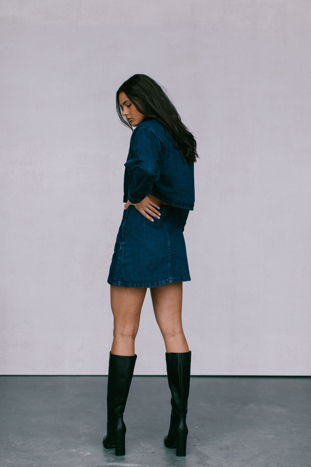 Our Dottie Jacket is a modern take on classic denim. Her cropped, boxy silhouette makes her the perfect layering piece for effortless styling. A must-have for a laid-back look, style with our matching Harlan Skirt for the ultimate combo.