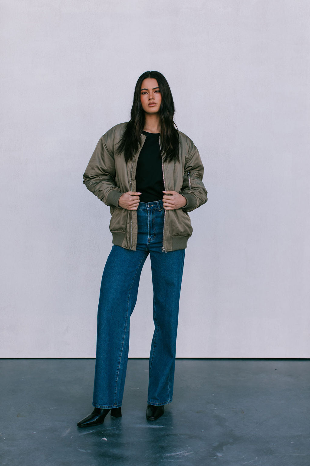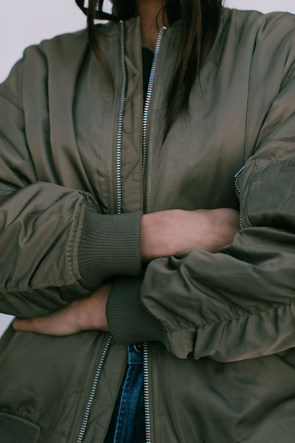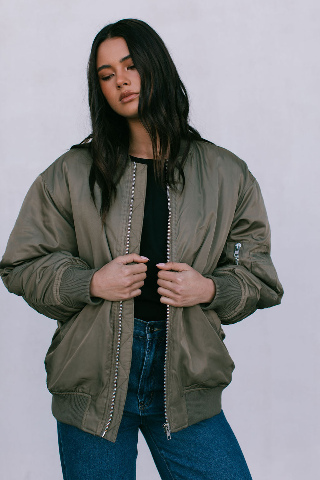 Level up your street style in our Estar Bomber Jacket. Featuring a luxe, khaki green sateen finish, relaxed fit with utility pocket detail, this oversized bomber is a must-have outerwear piece for any off-duty or casual-cool wardrobe.
