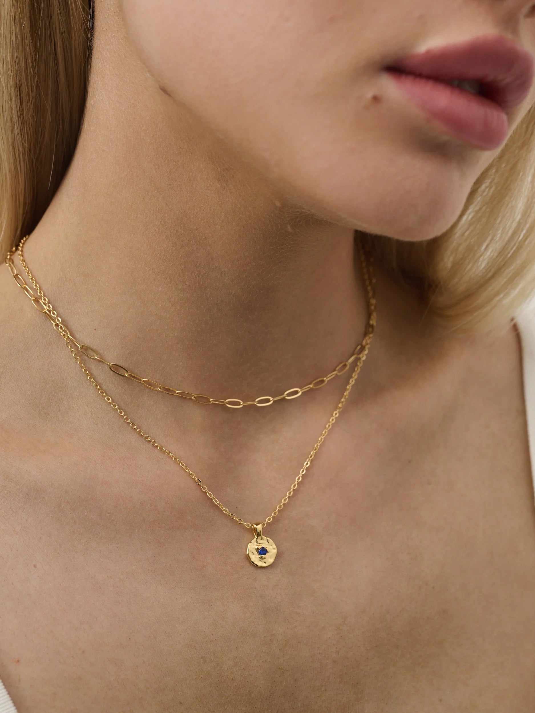 Our Birthstone Necklaces feature a fine gold plated chain + sweet hammered finish, round pendent with correlating month's birthstone.
