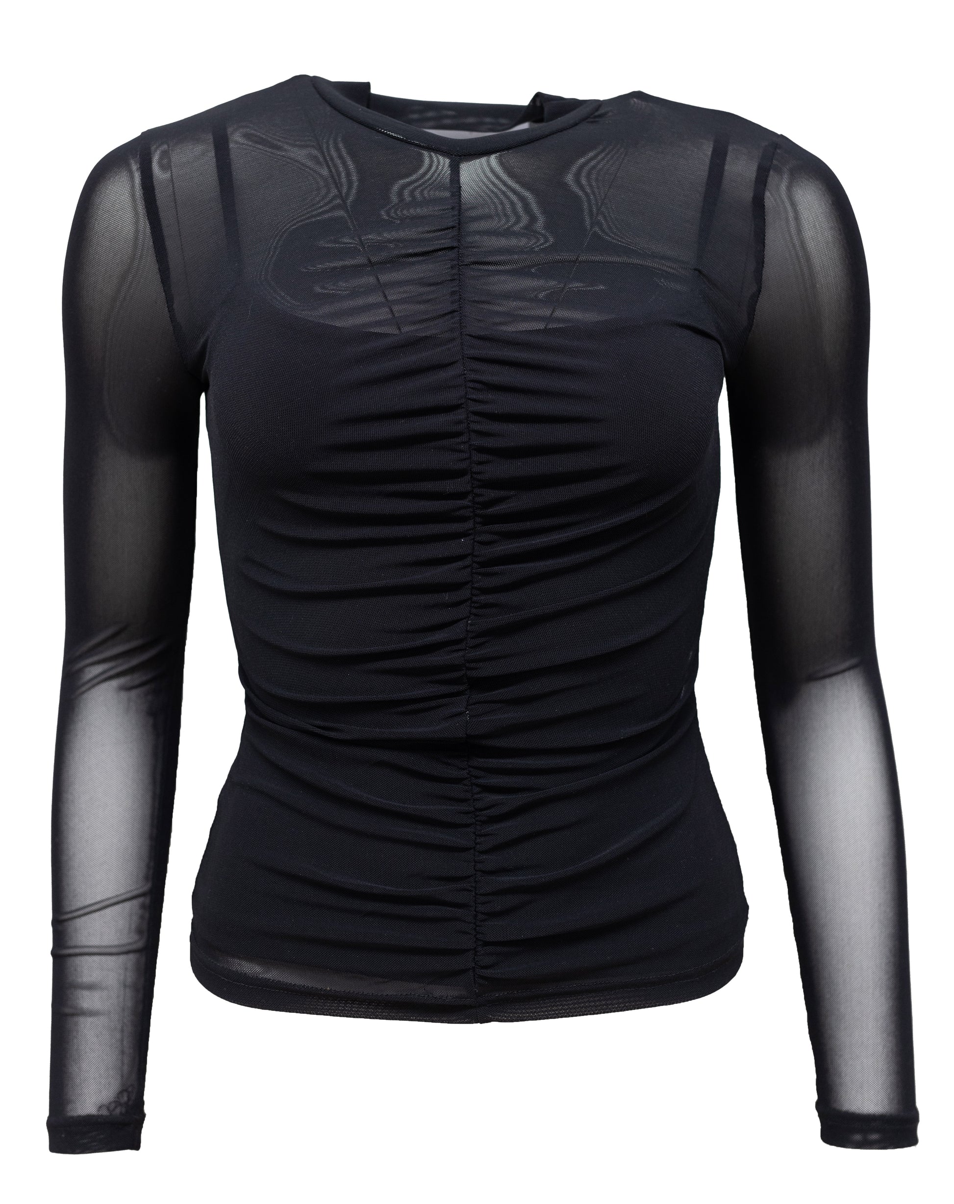 Stunning sheer mesh long-sleeve top. Classic black hued mesh fabrication.