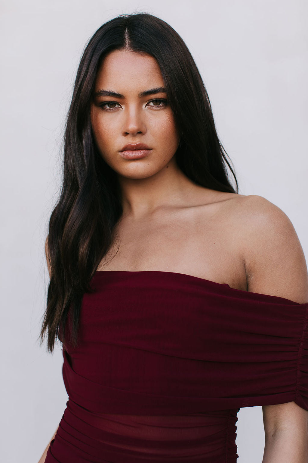 Stand out in our Fiora Dress. An elegant burgundy mesh midi with sheer mesh + cut-out details for a chic, modern look. Her off-shoulder folded neckline + asymmetrical hip cut-out adds a bold touch. Make a memorable impression in Fiora.