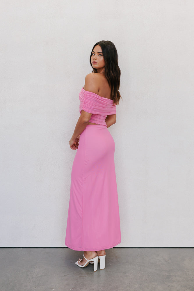 Stand out in our Fiora Dress. A stunning pink mesh midi with sheer mesh + cut-out details for a chic, modern look. Her off-shoulder folded neckline + asymmetrical hip cut-out adds a bold touch. Make a memorable impression in Fiora.