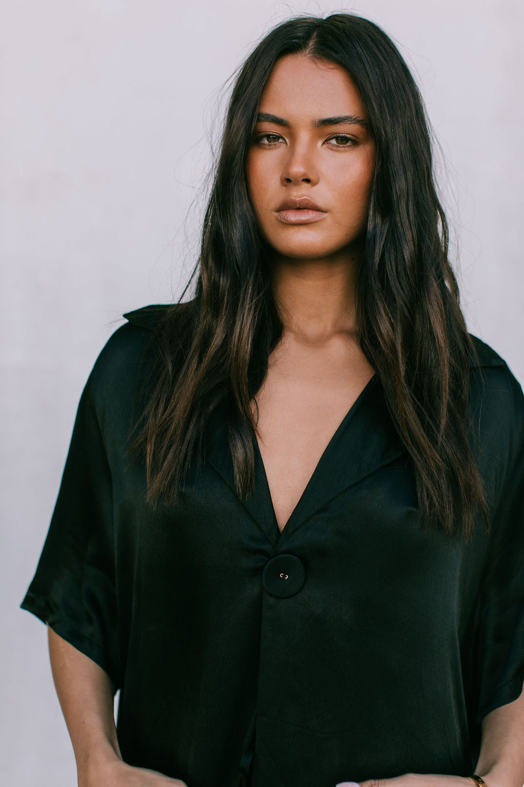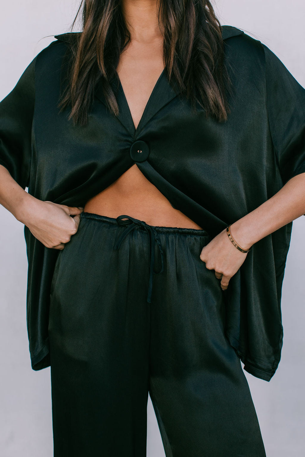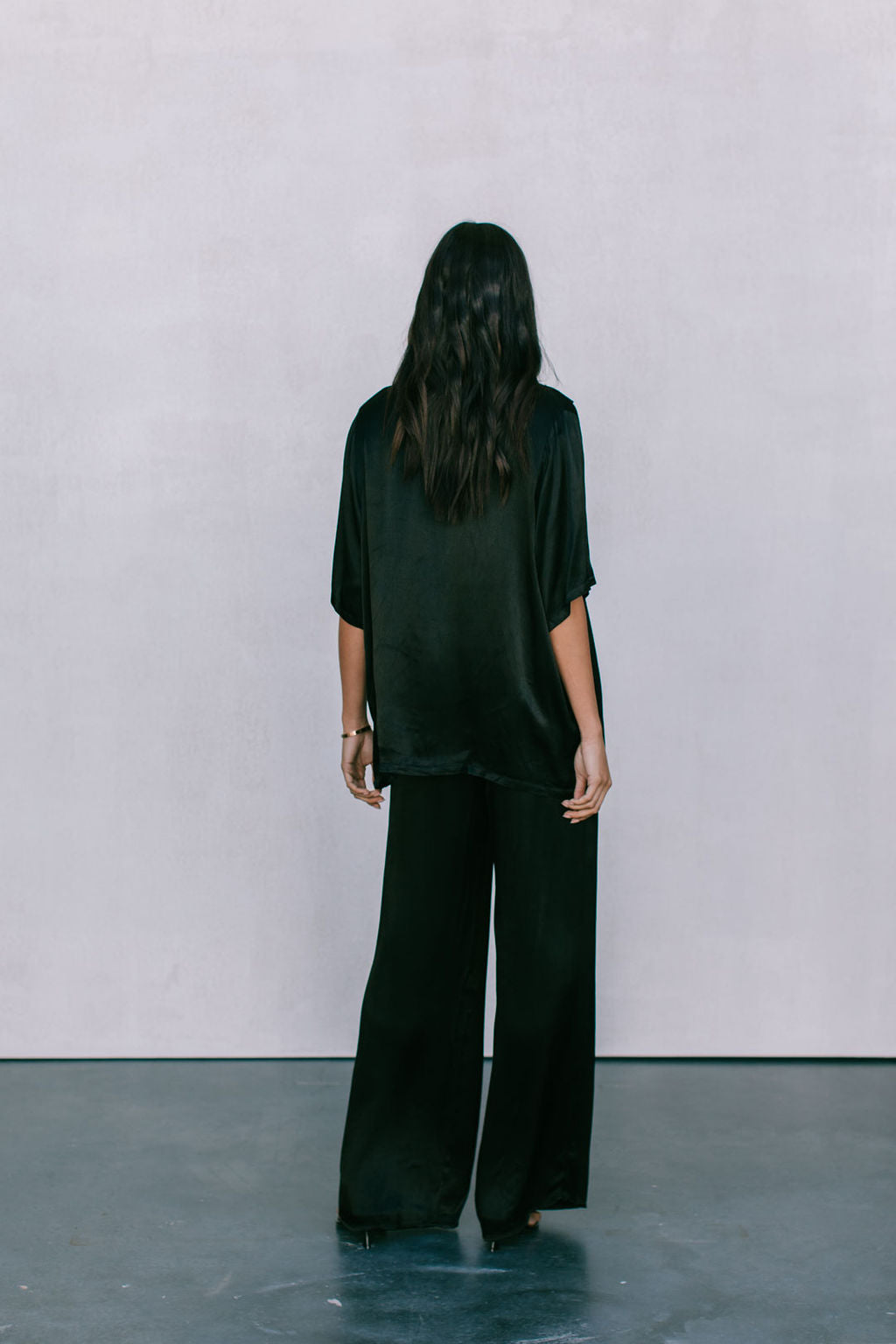 Stunning satin oversized relaxed shirt with button. Classic black satin fabrication.