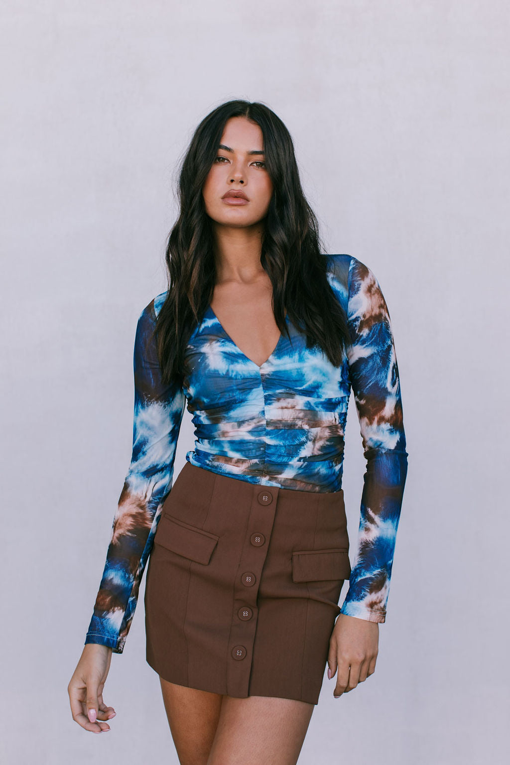 Bold blue, navy, chocolate + white haze printed mesh, long-sleeve top for woman.