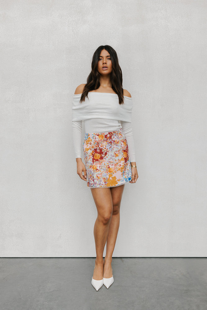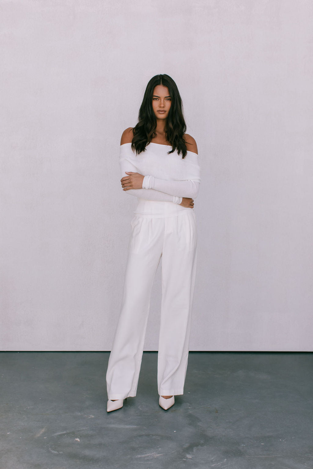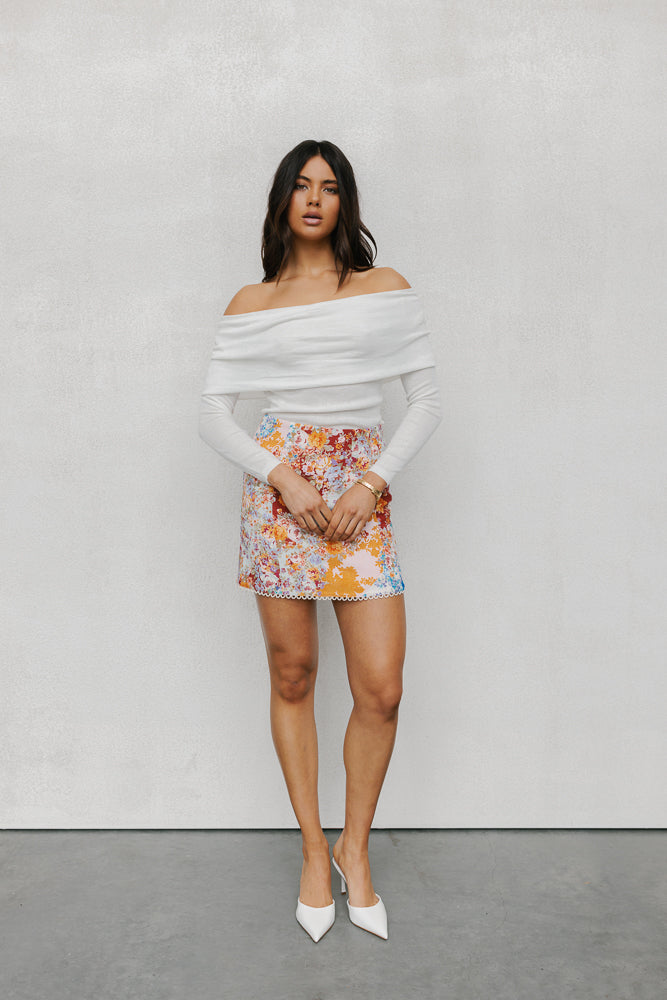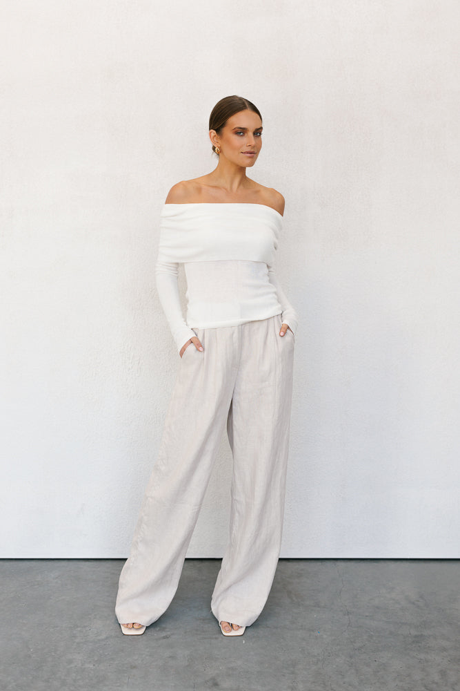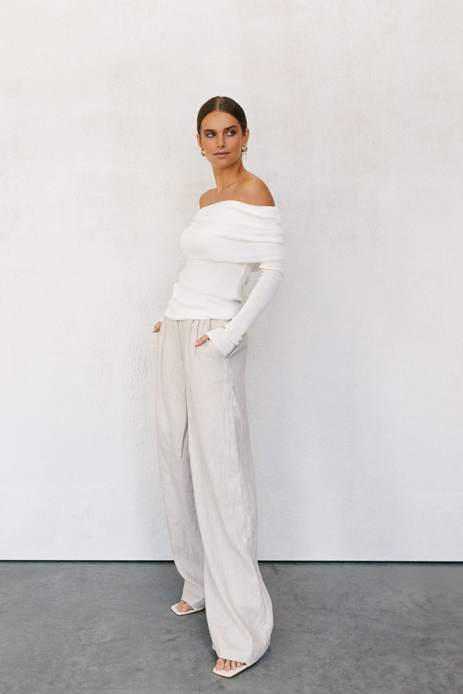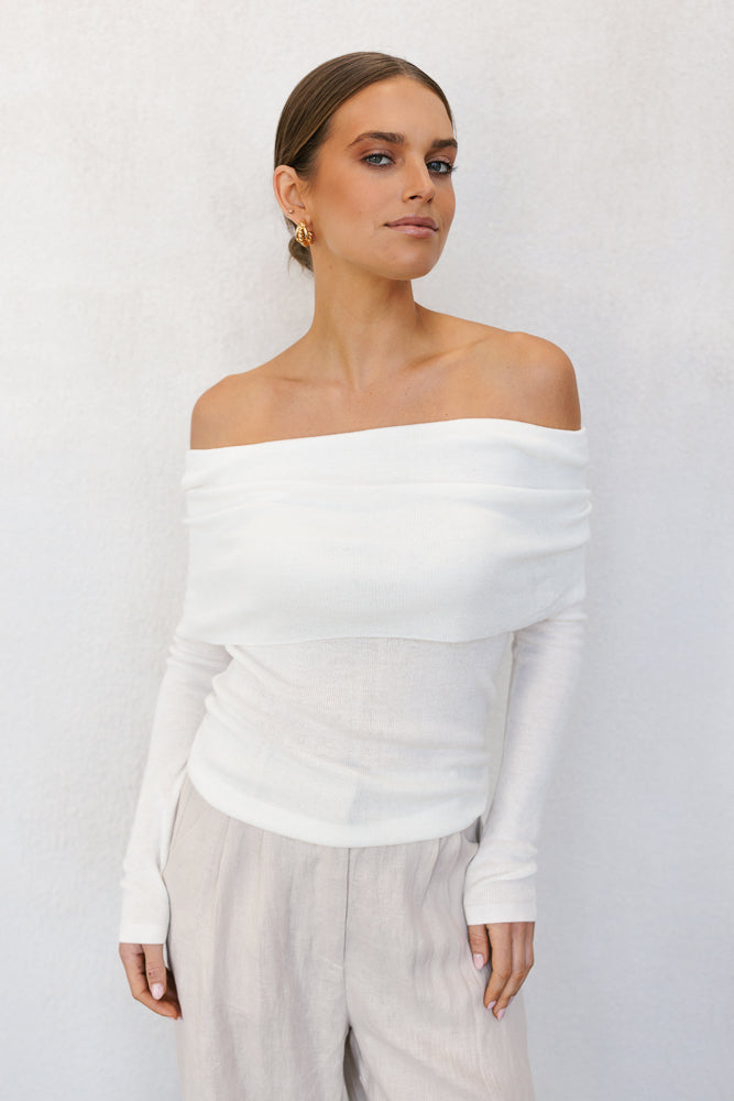 Elevate your style in our exclusive Garnet Top by Rosie. Designed to flatter, this ivory white off-shoulder knit top boasts a folded neckline + fitted silhouette. Outfit day to night, this versatile knit top is perfect for layering or styling alone.