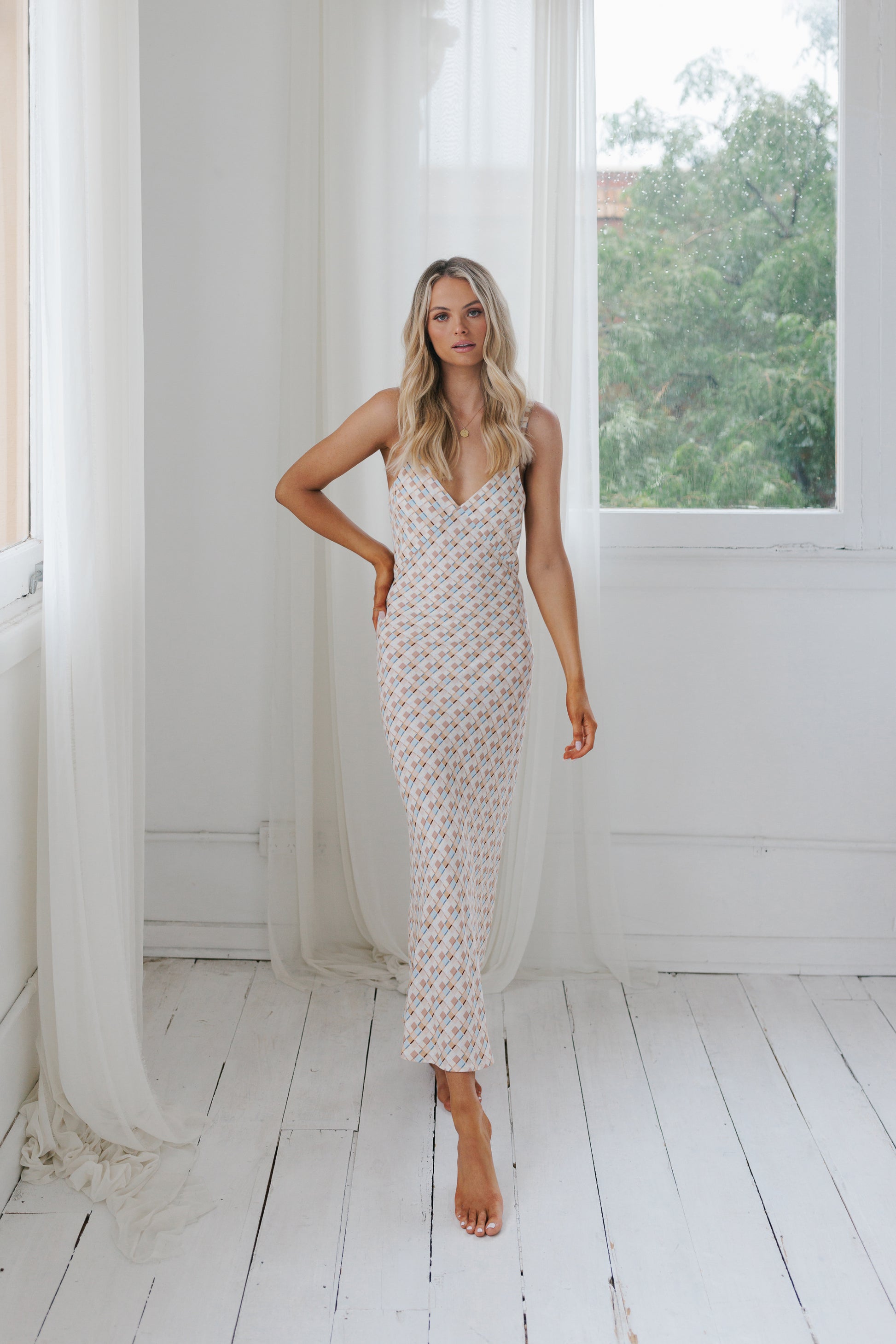 Our Giro Dress by BAIA is a captivating slip style that embodies a perfect blend of trendiness + timeless elegance. An effortless beige + sky blue check print + graceful silhouette poised to be a signature piece, ensures a versatile midi.