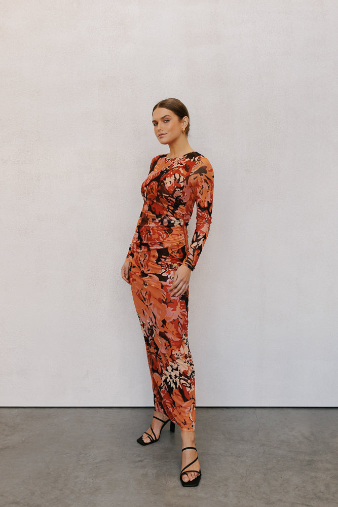 Our Helena Dress, exclusive to MMB by Rosie, boasts a stunning autumn hued floral printed mesh in a timeless midi silhouette. Her round neckline + side ruching detailing adds a touch of sophistication to this elegant + effortless midi.