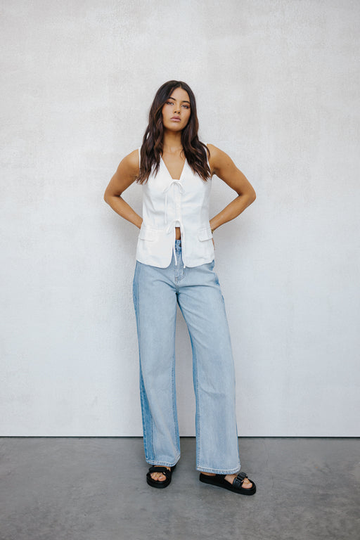 Our Hermonie Vest blends sophistication + versatility tailored to elevate your wardrobe. Crafted in sweet white linen blend, she exudes timeless charm with a modern twist. An elegant silhouette + longer length effortlessly transitions day to night.
