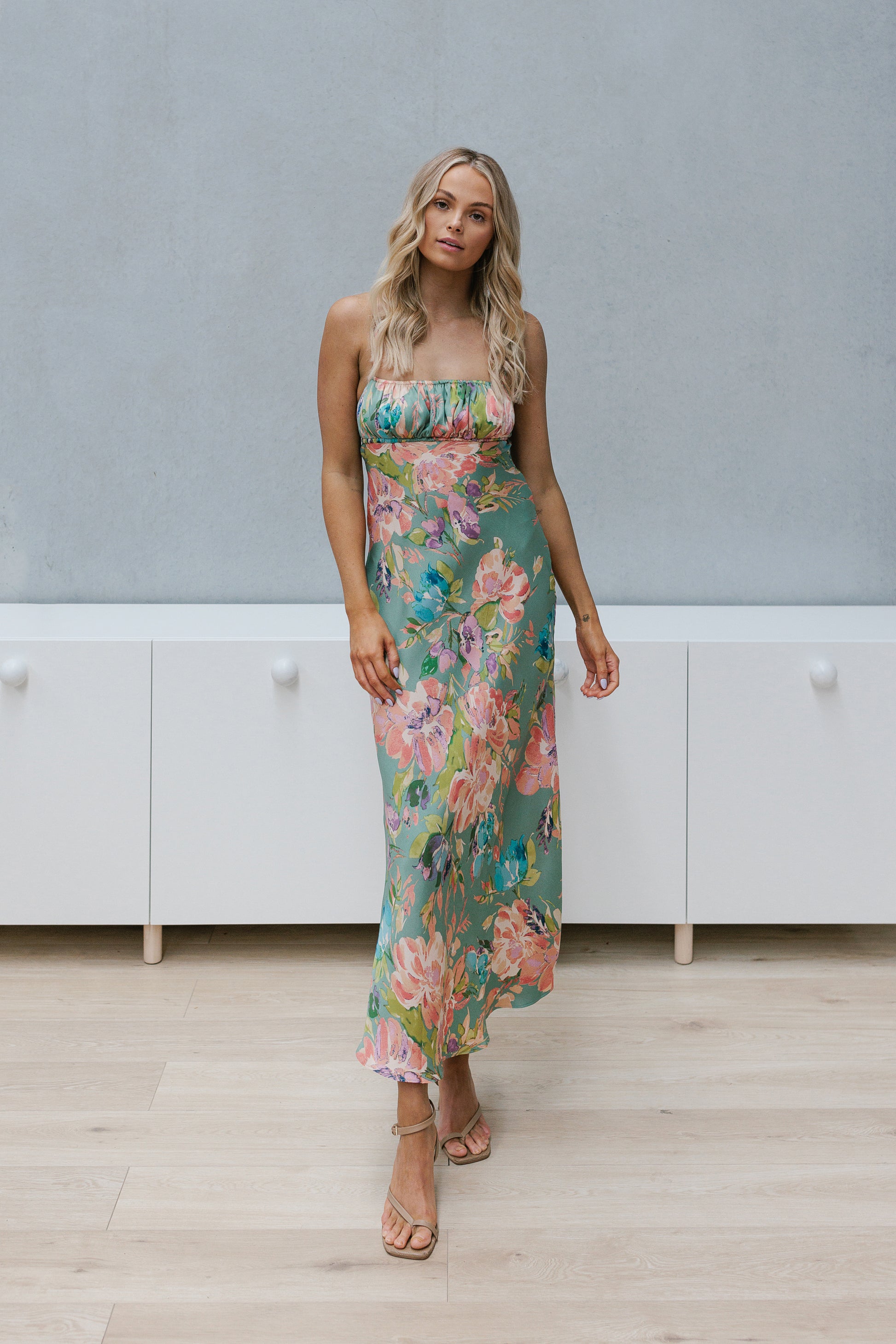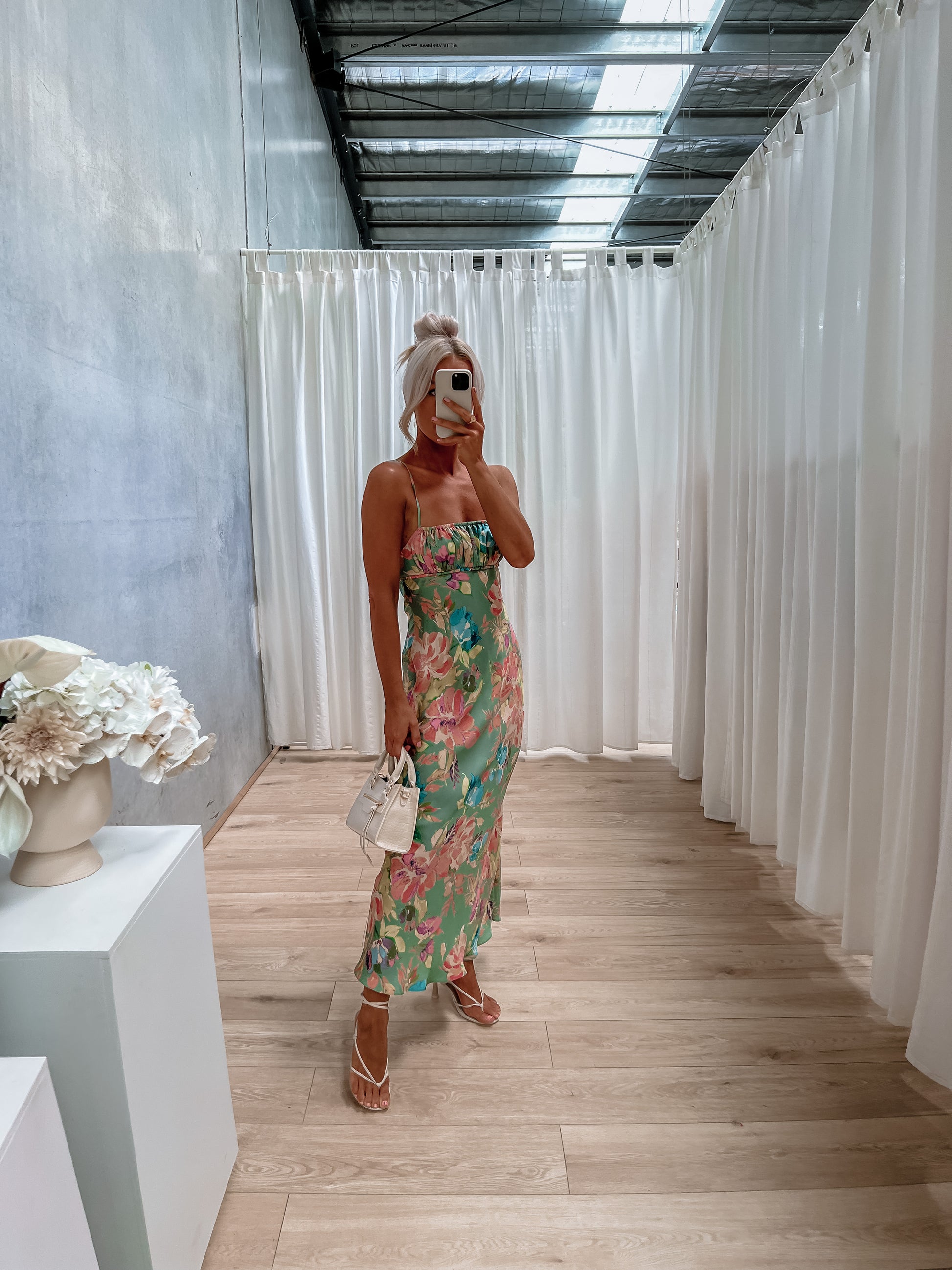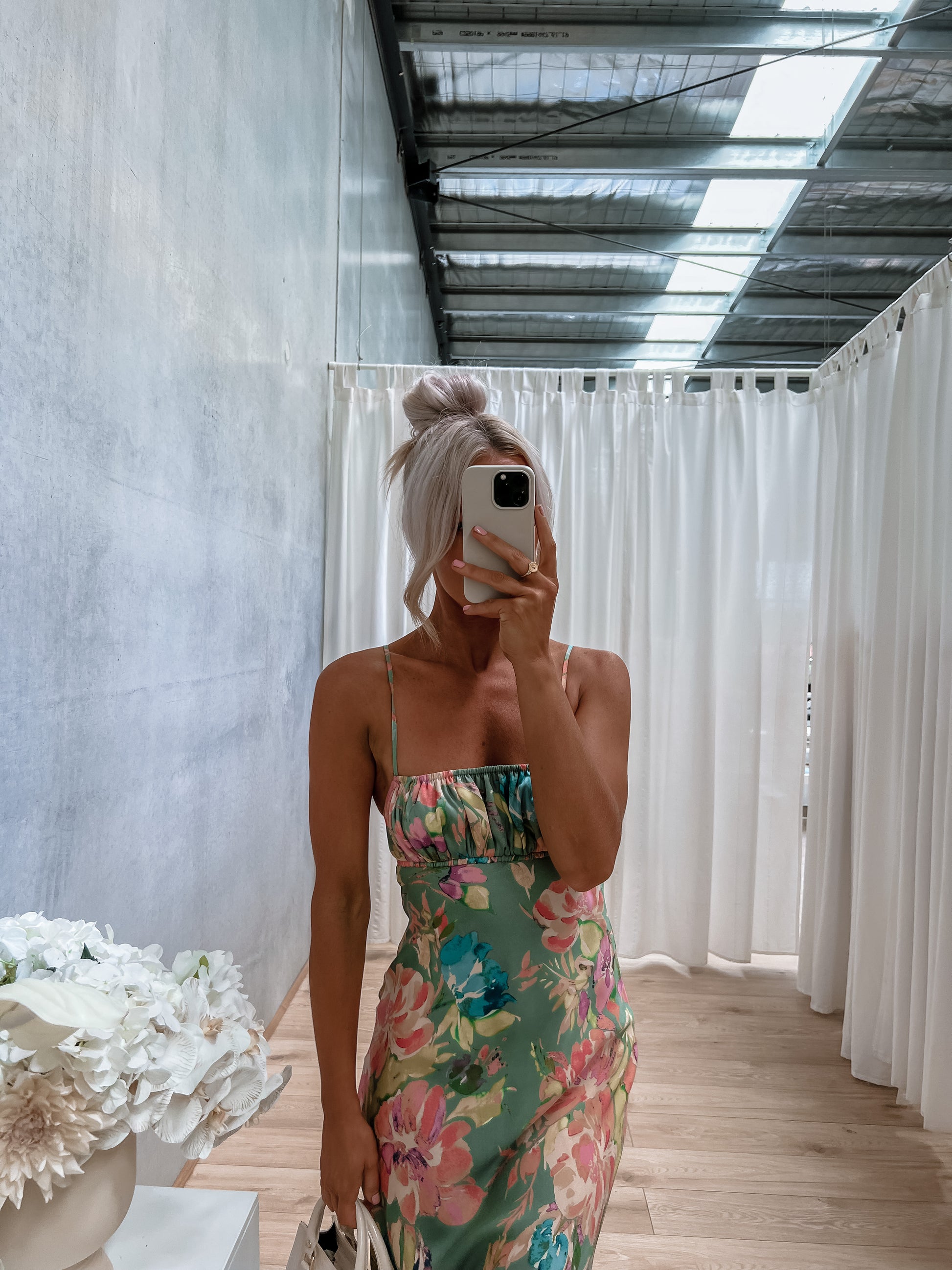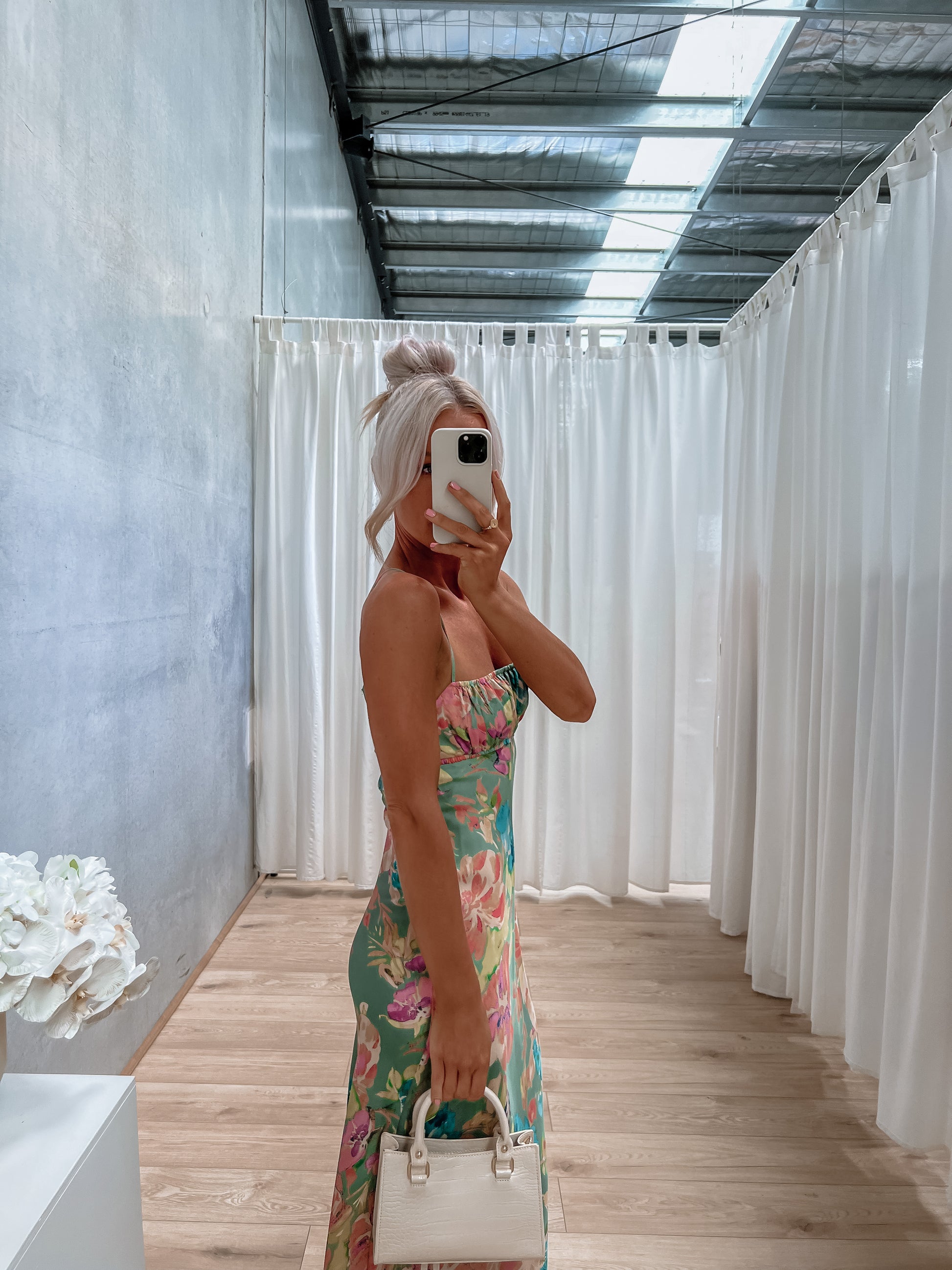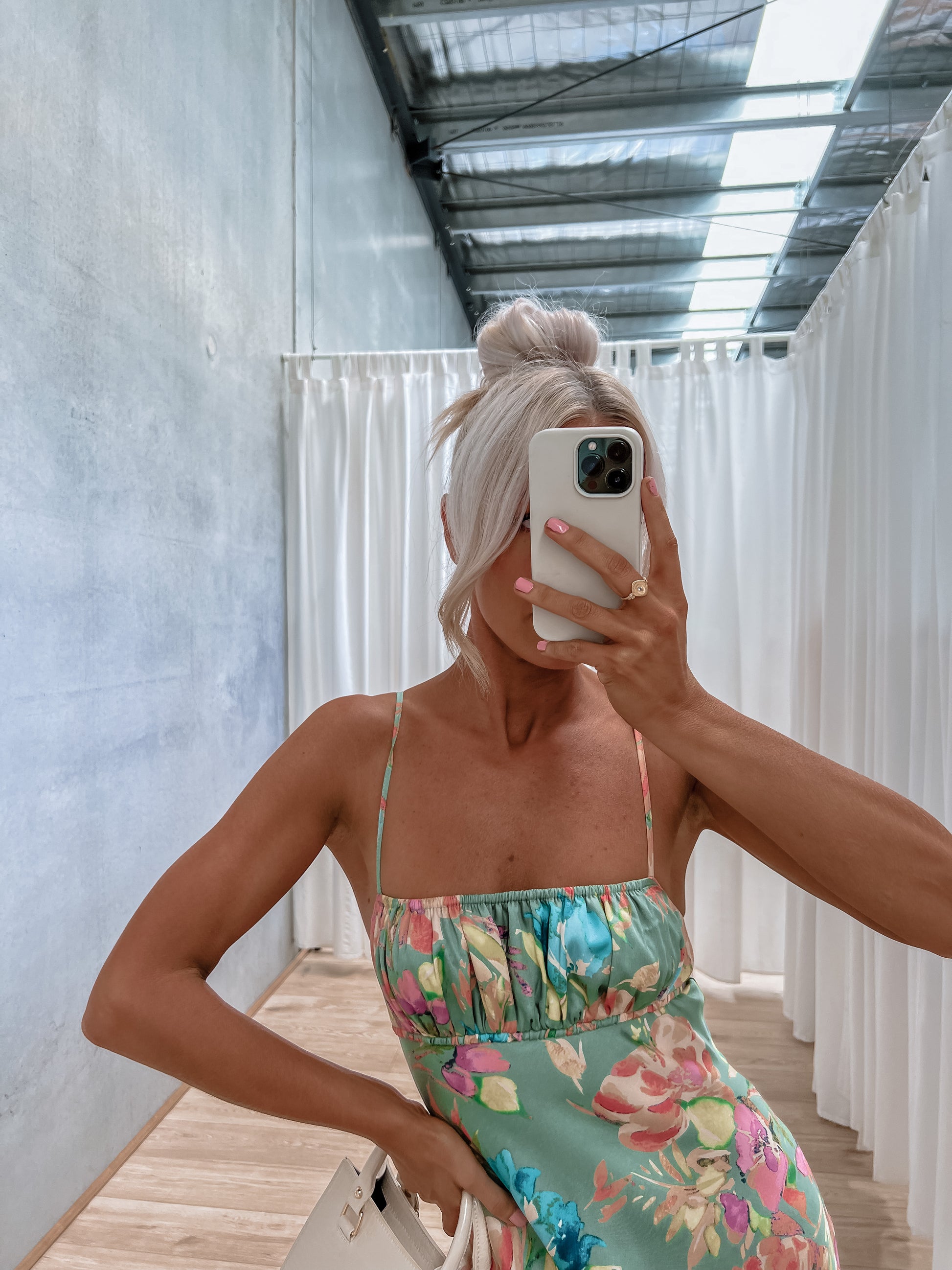 Illie is everything you want in a dress ~ from her beautiful colour palette, floral print + detailing, she is sure to please. From her ruched bust detail, she falls into a classic, feminine slip style dress. We love styled with cream accessories + go