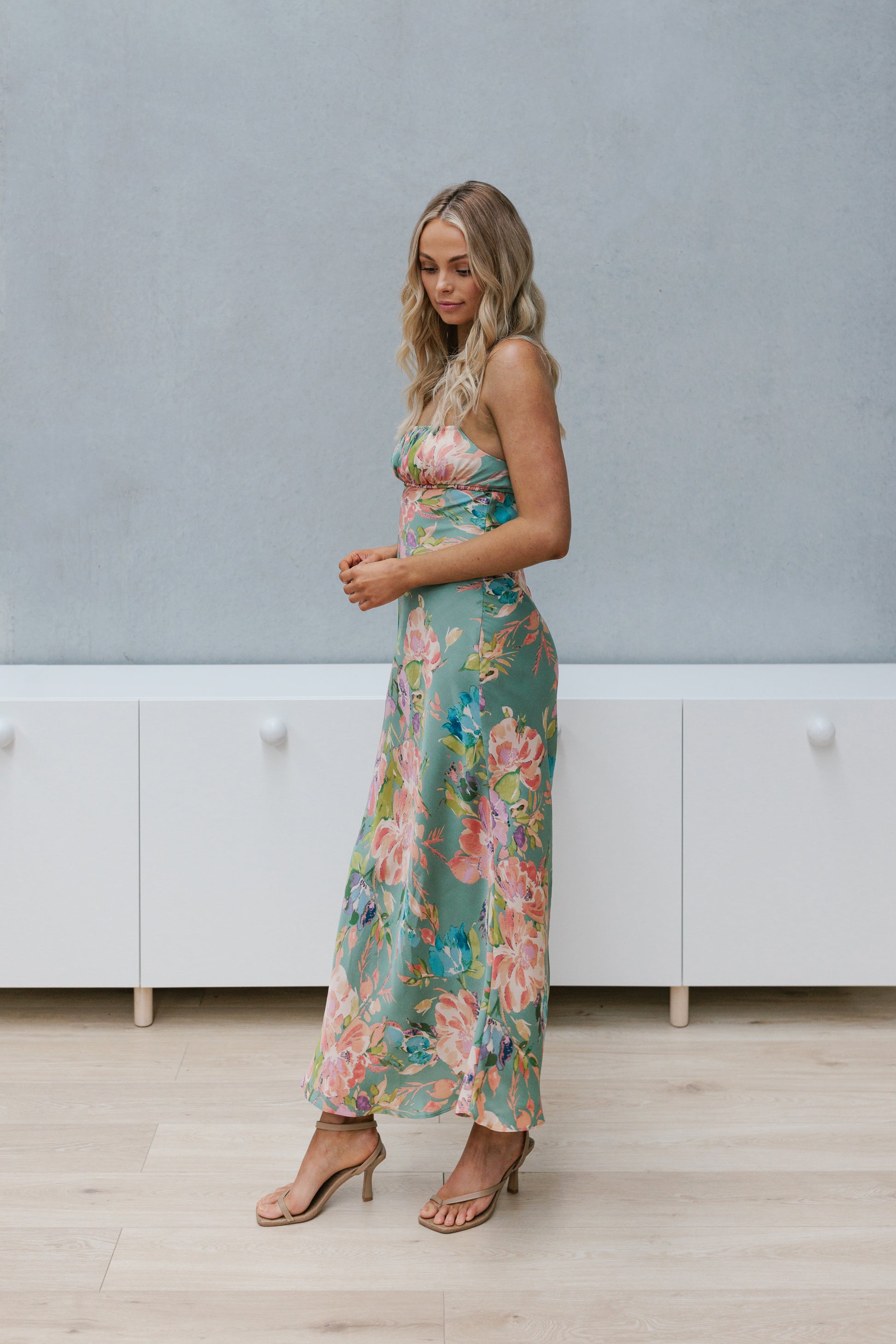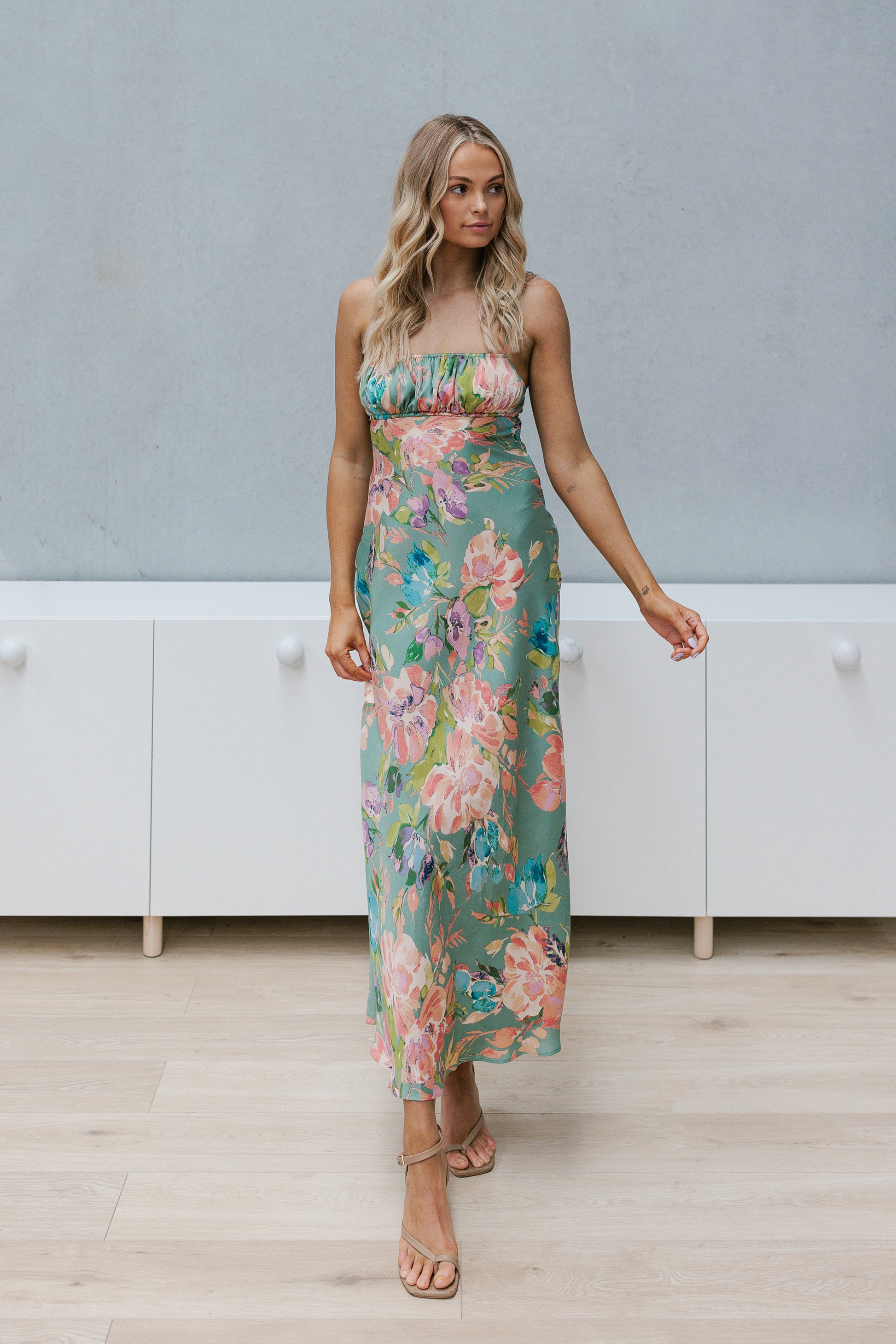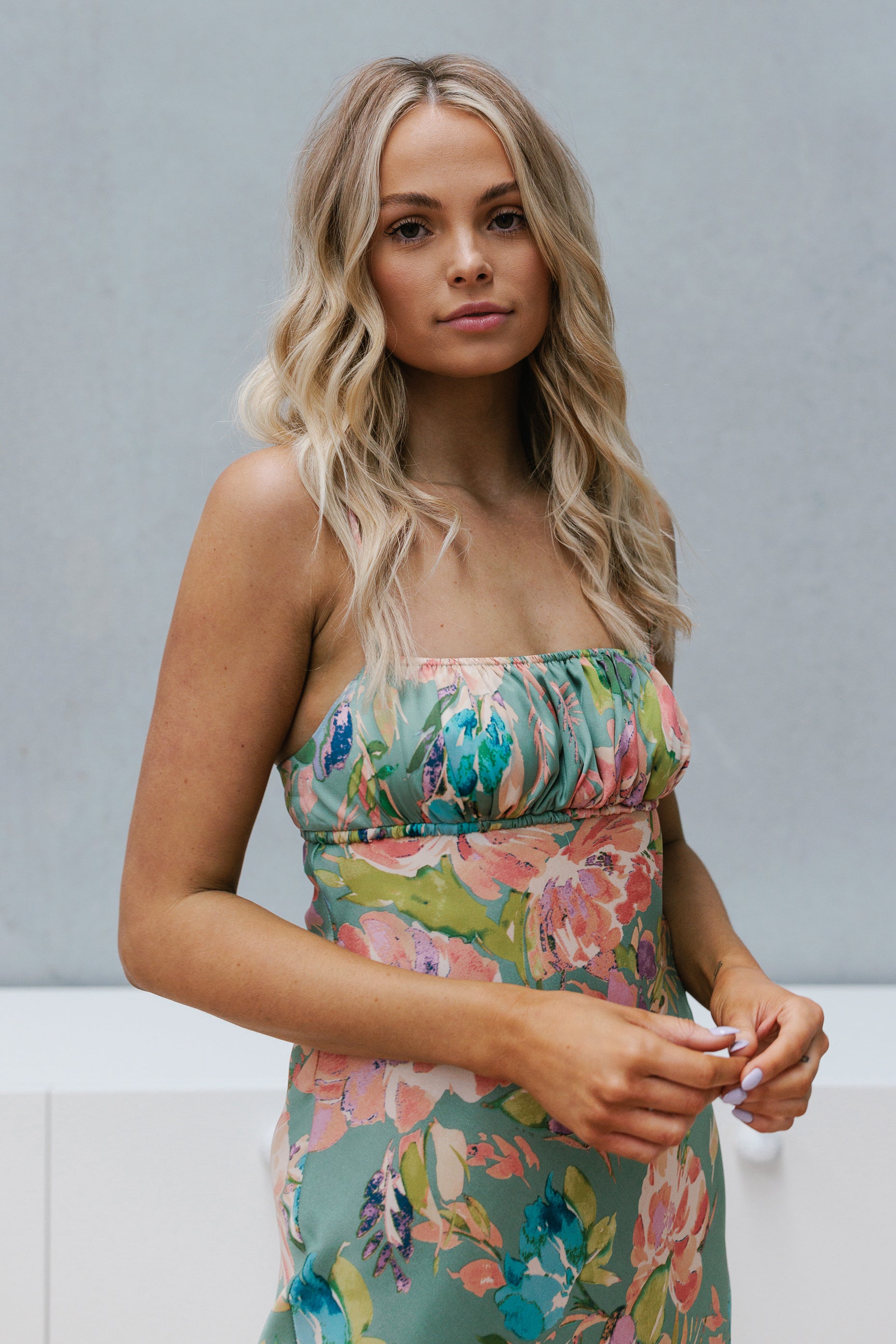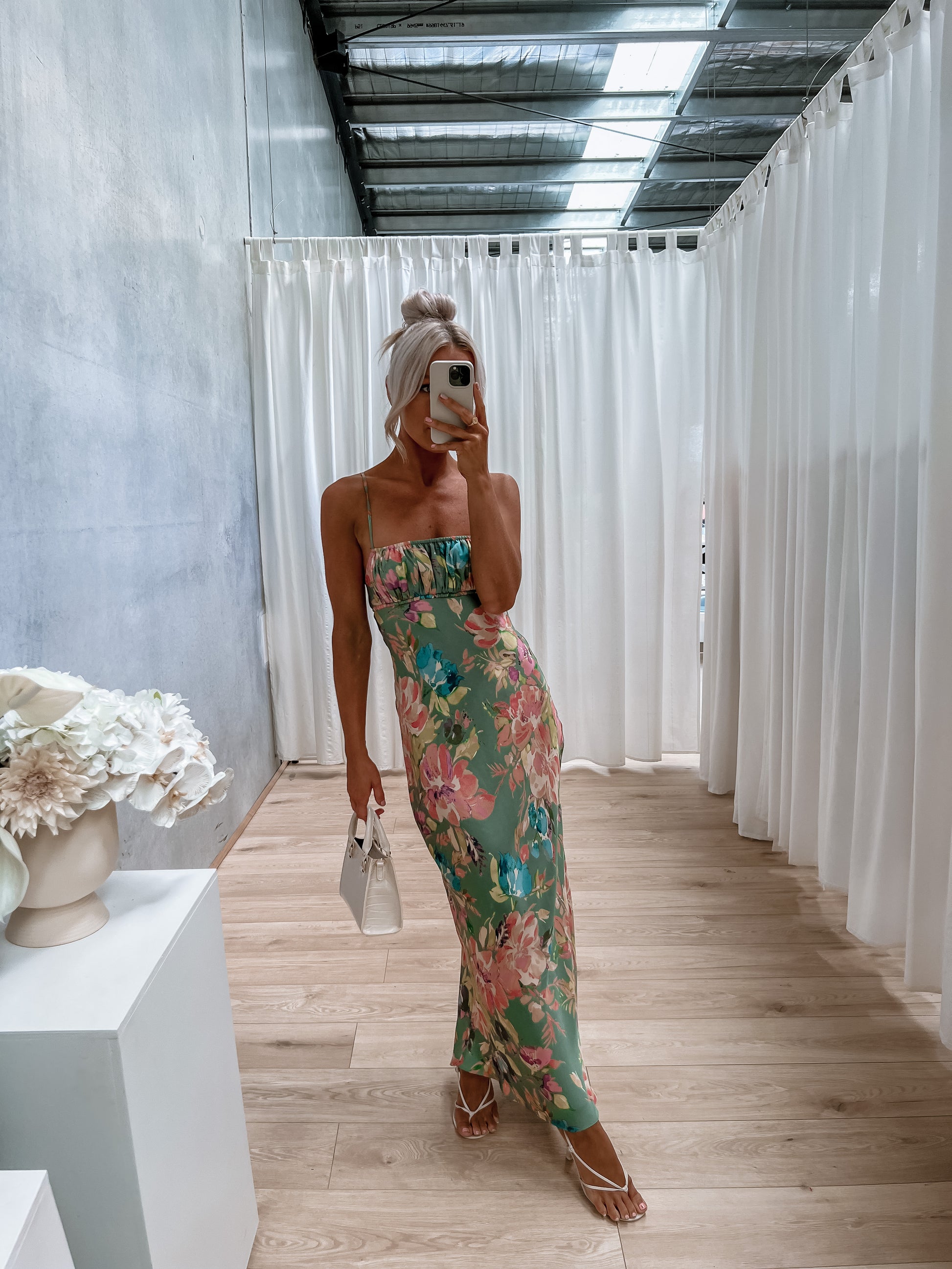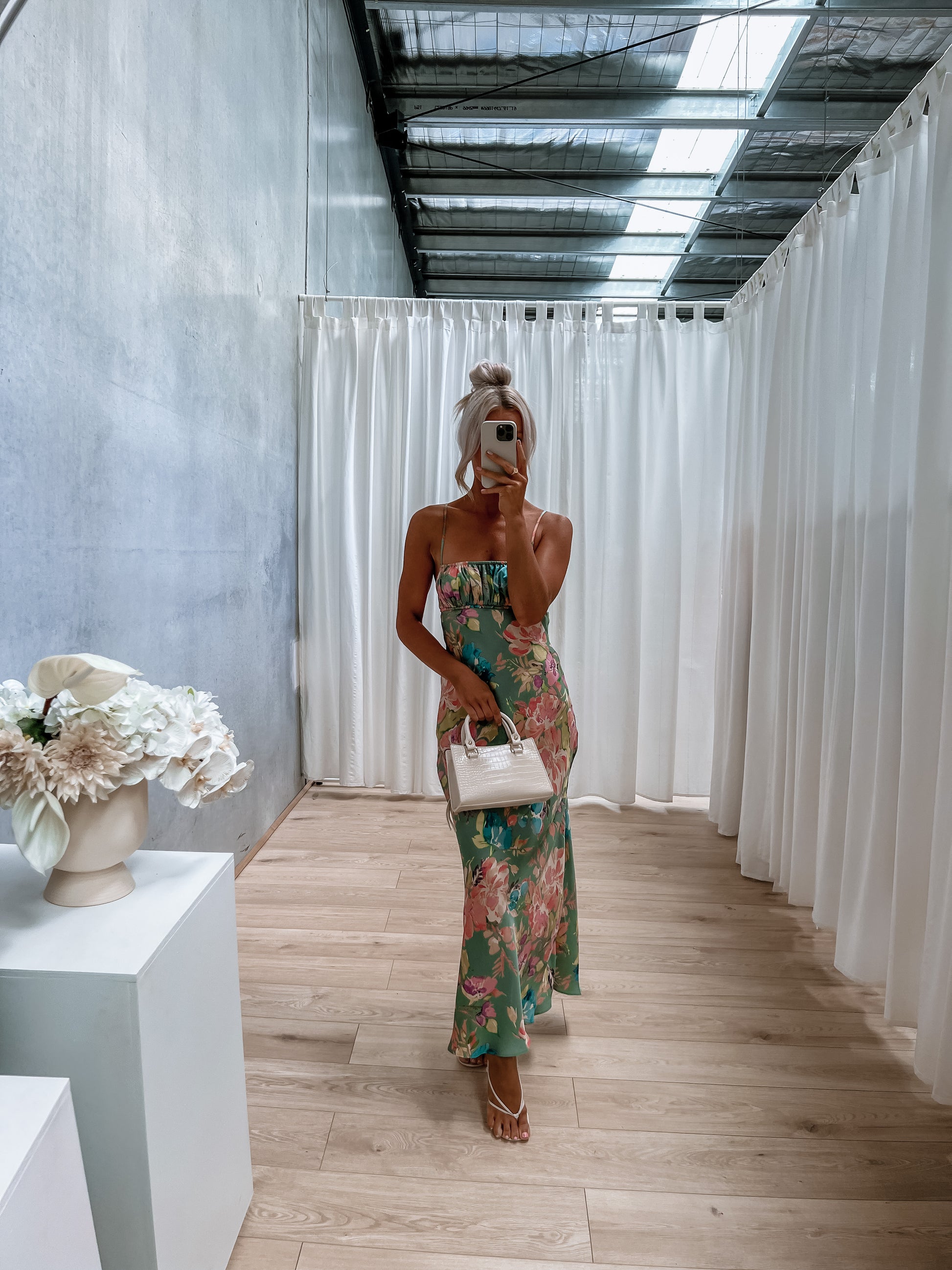 Illie is everything you want in a dress ~ from her beautiful colour palette, floral print + detailing, she is sure to please. From her ruched bust detail, she falls into a classic, feminine slip style dress. We love styled with cream accessories + go