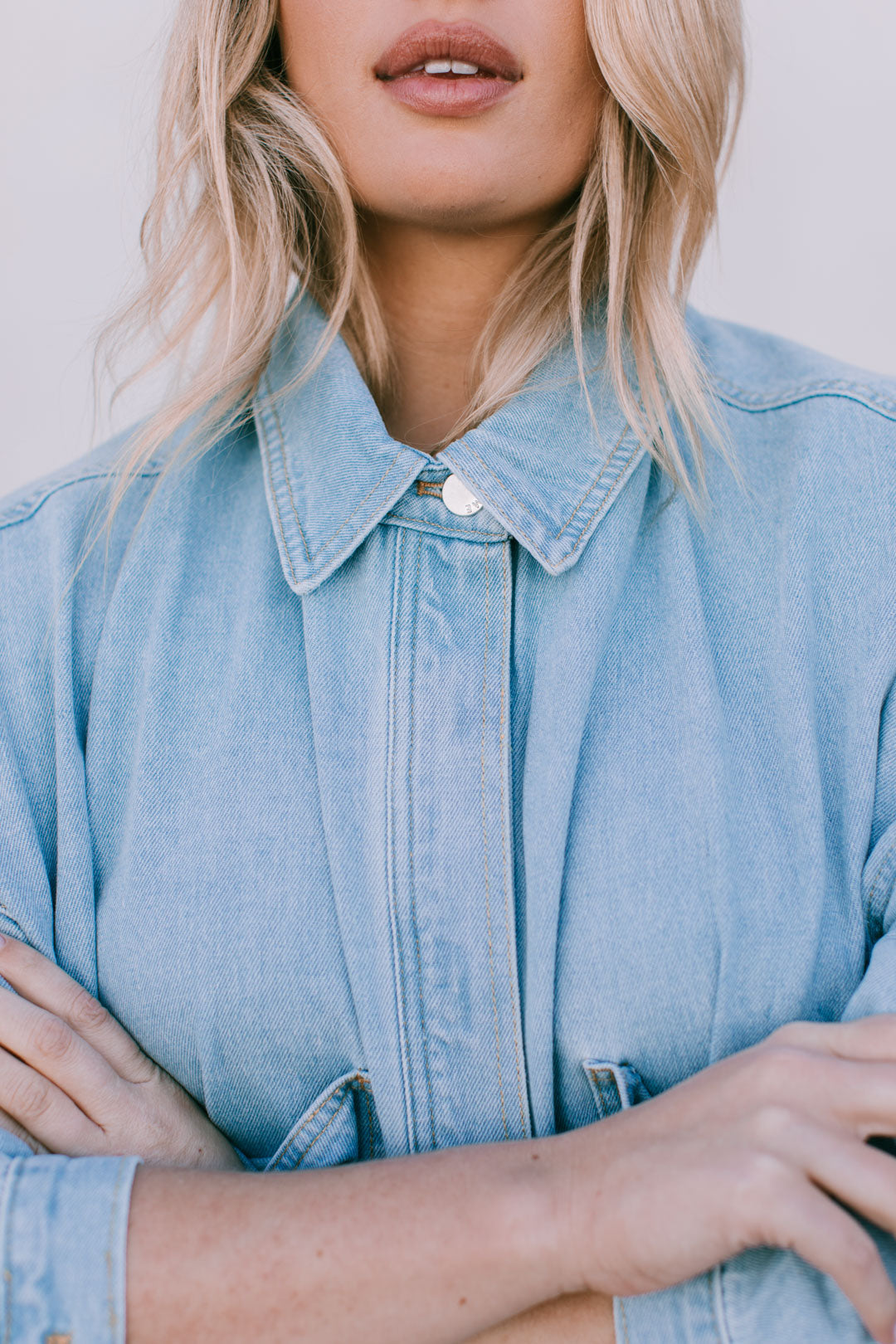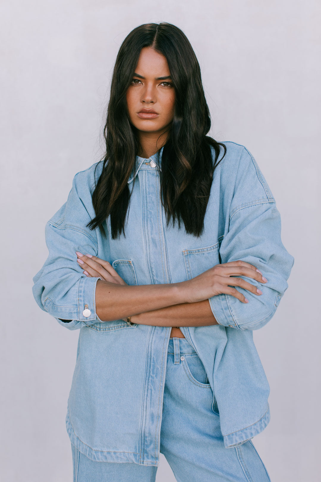 Relaxed fit denim overshirt for the modern woman. Premium soft-feel 100% Cotton, Light Wash Blue denim.