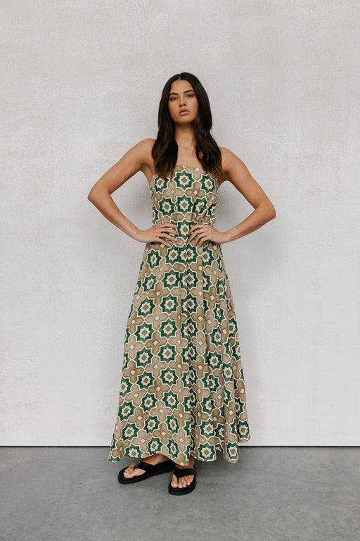 Our exclusive Isola Mini Dress by BAIA is a must-have, this modern mini combines timeless elegance + flirty charm. Crafted in a bold geometric, washed khaki tile printed linen blend, her flattering a-line silhouette is oh so versatile.
