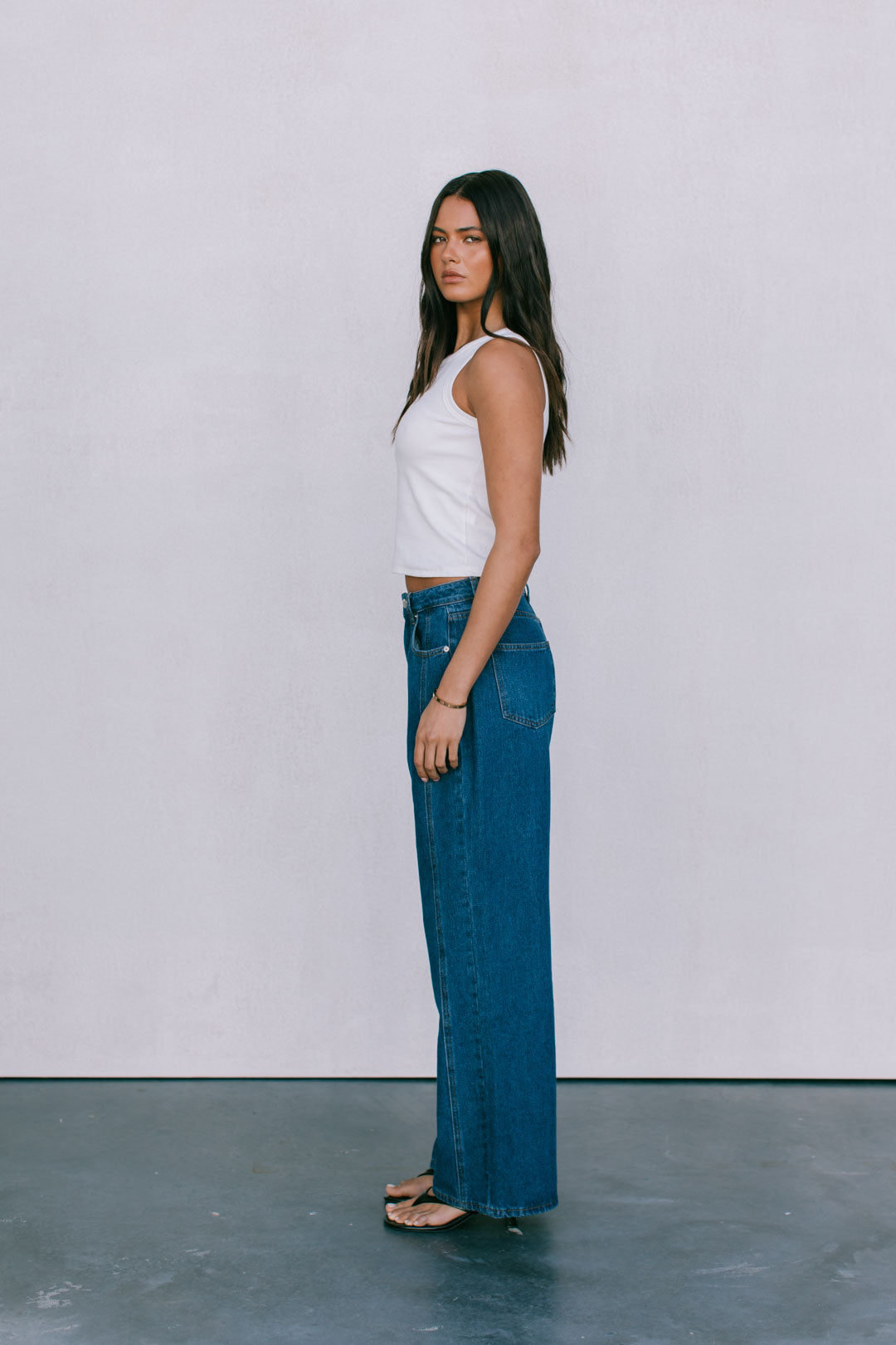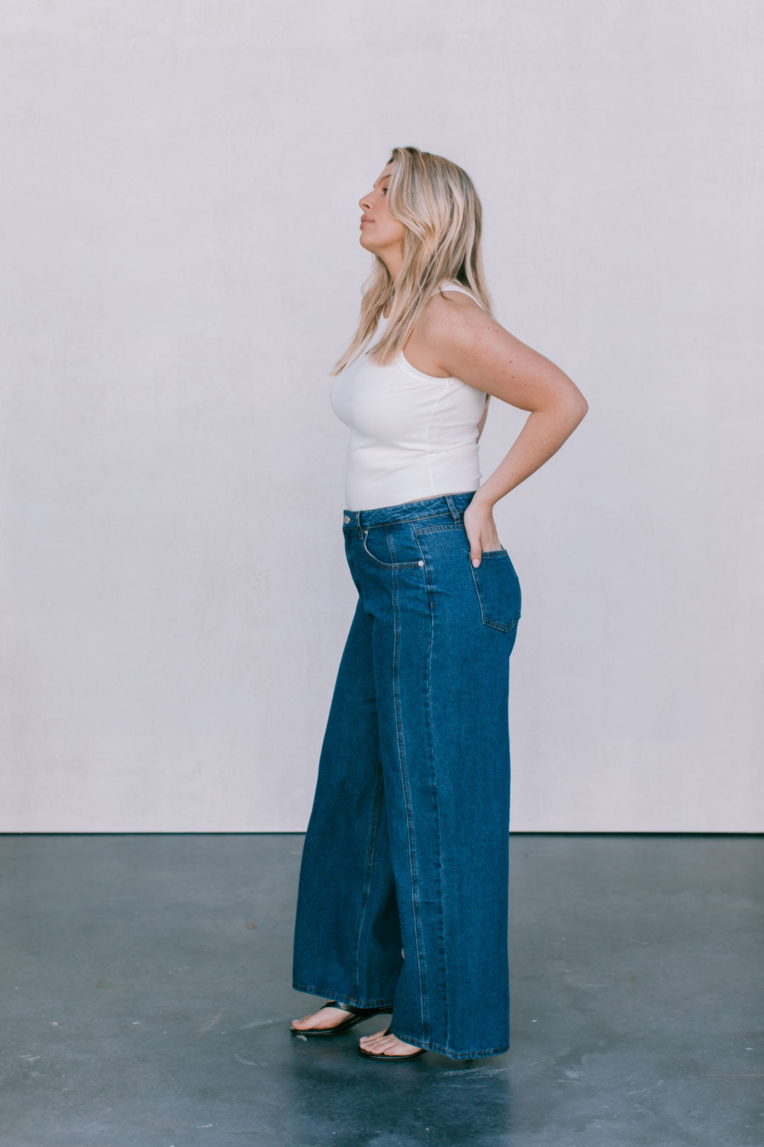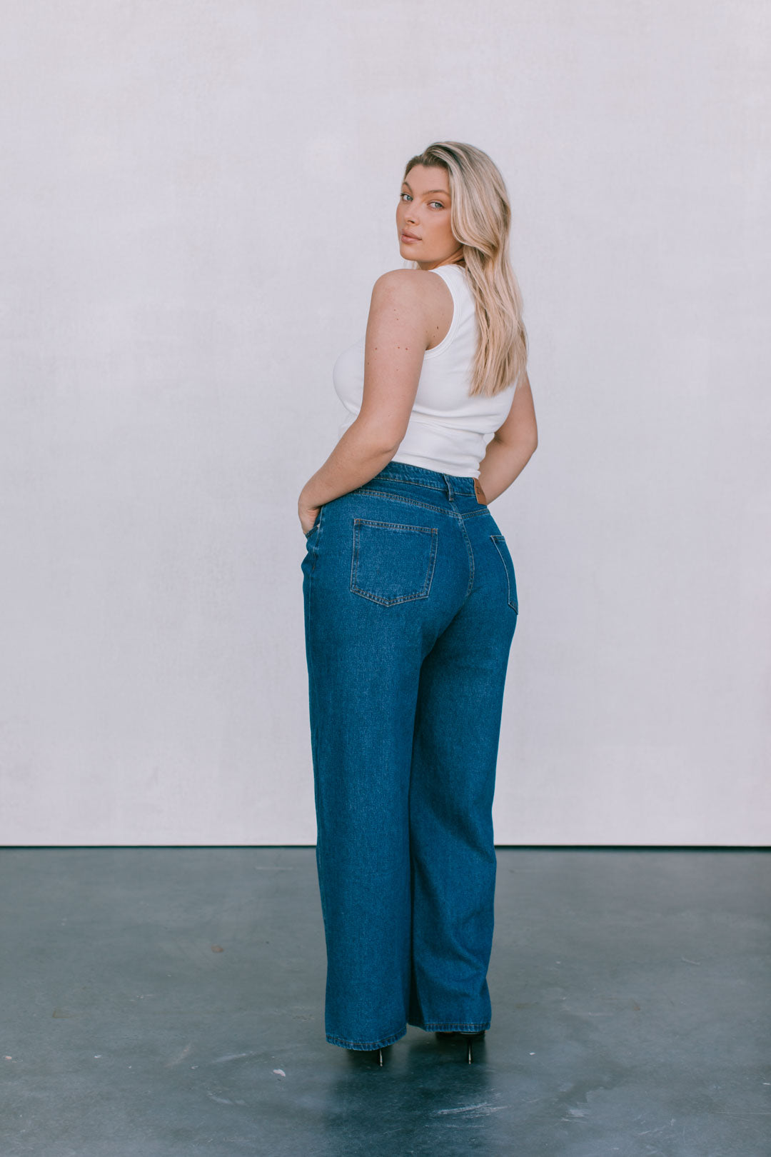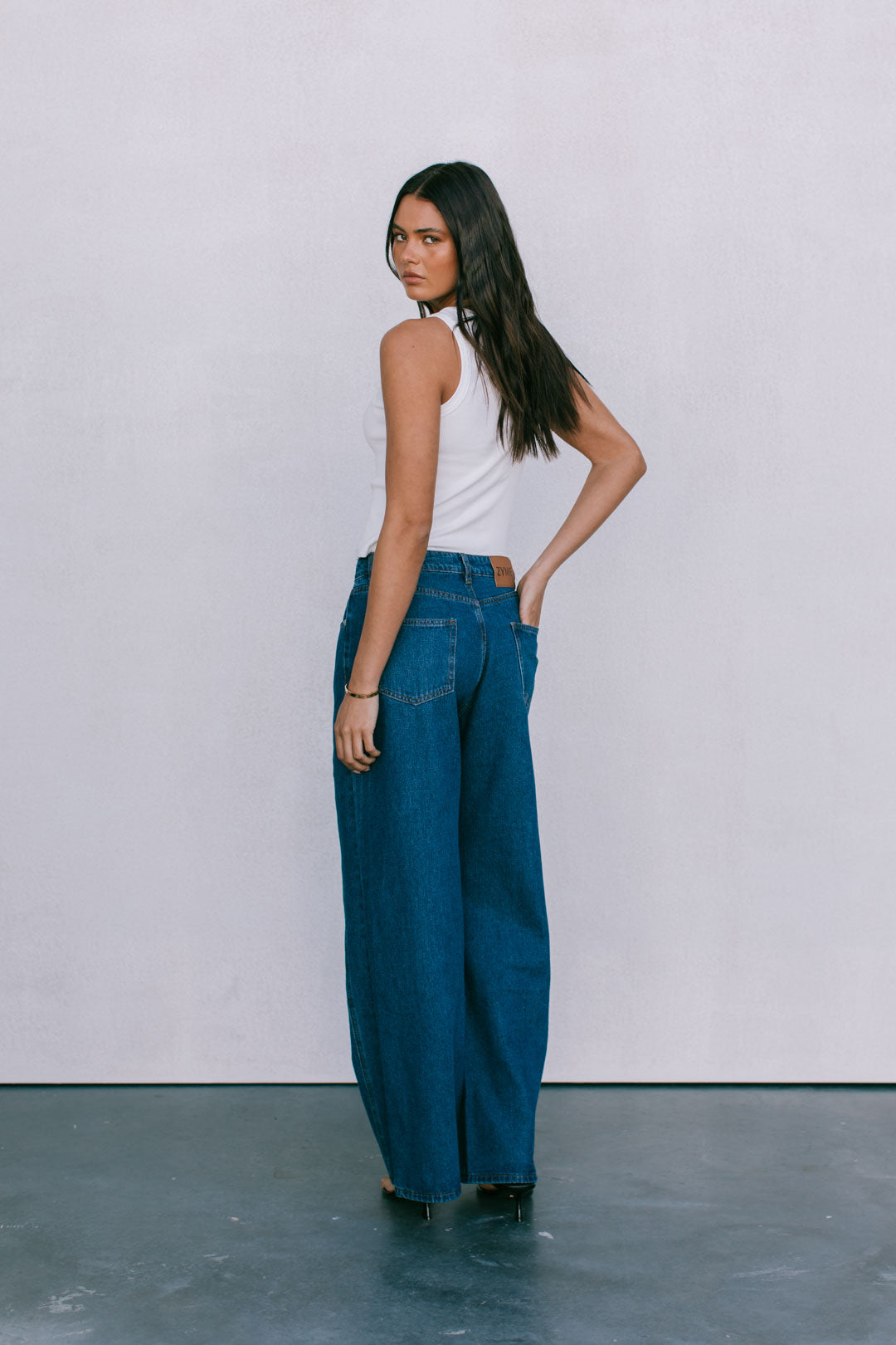 Ultra baggy, wide leg silhouette denim jeans. Premium, soft-feel cotton Dark Wash Blue denim.
