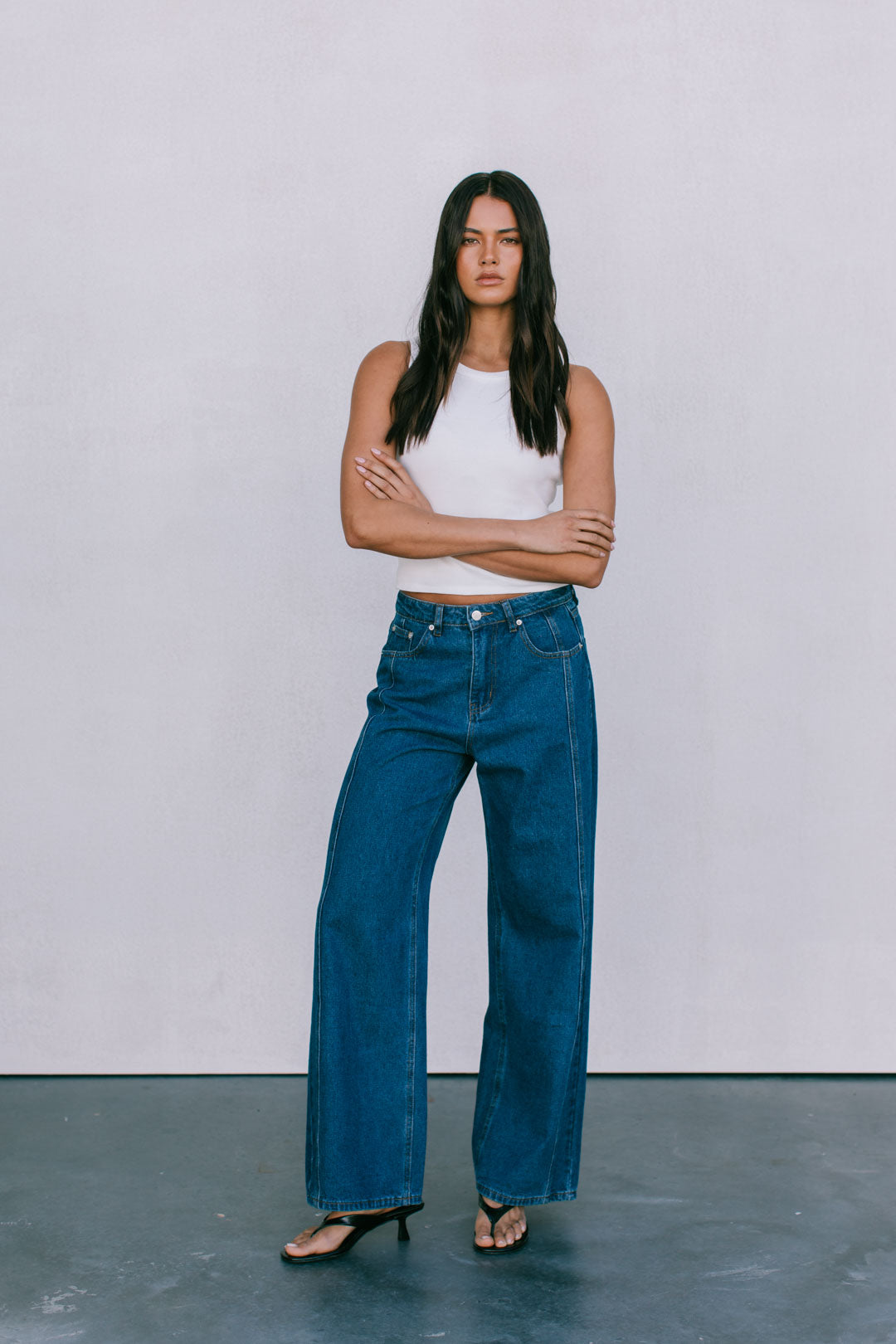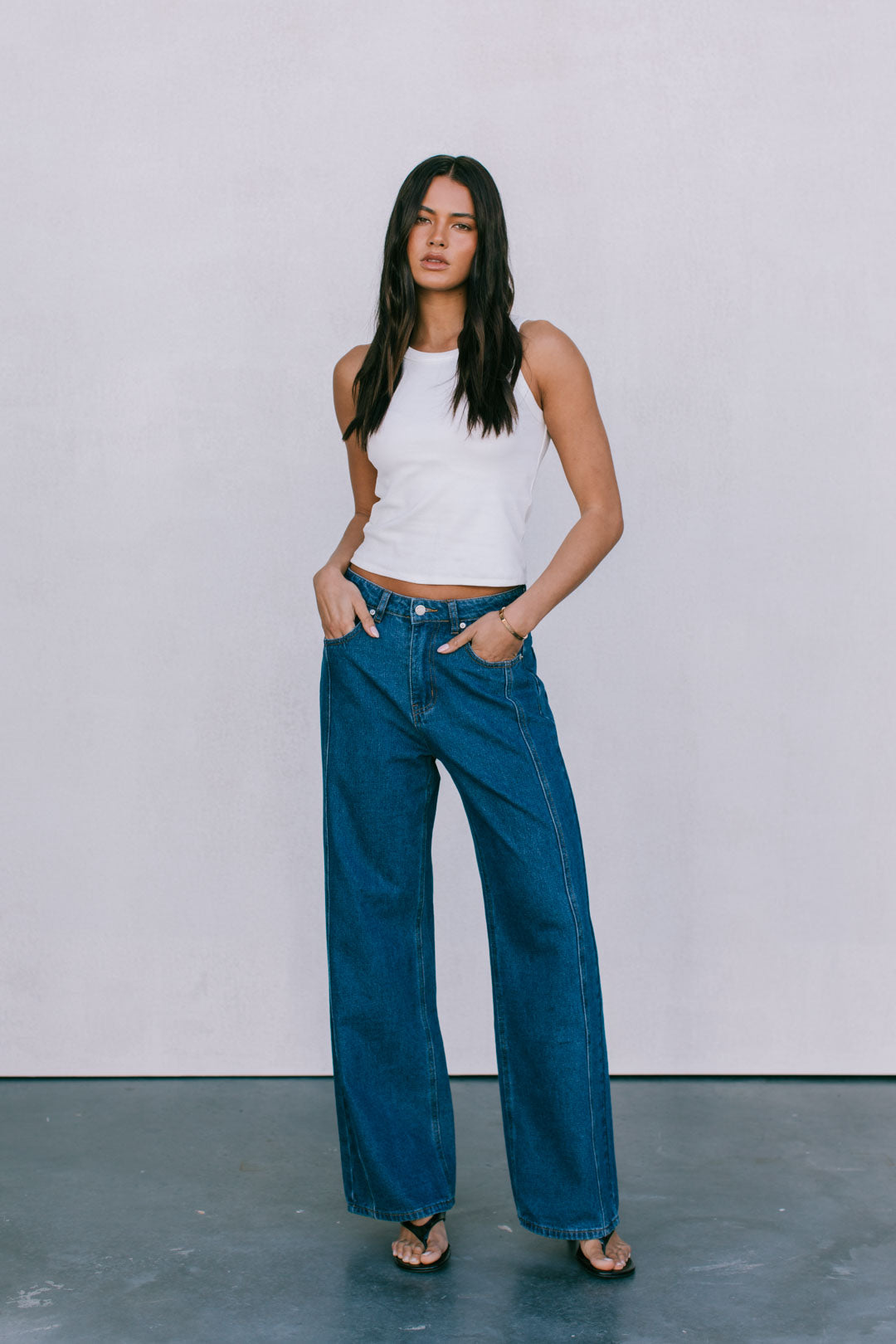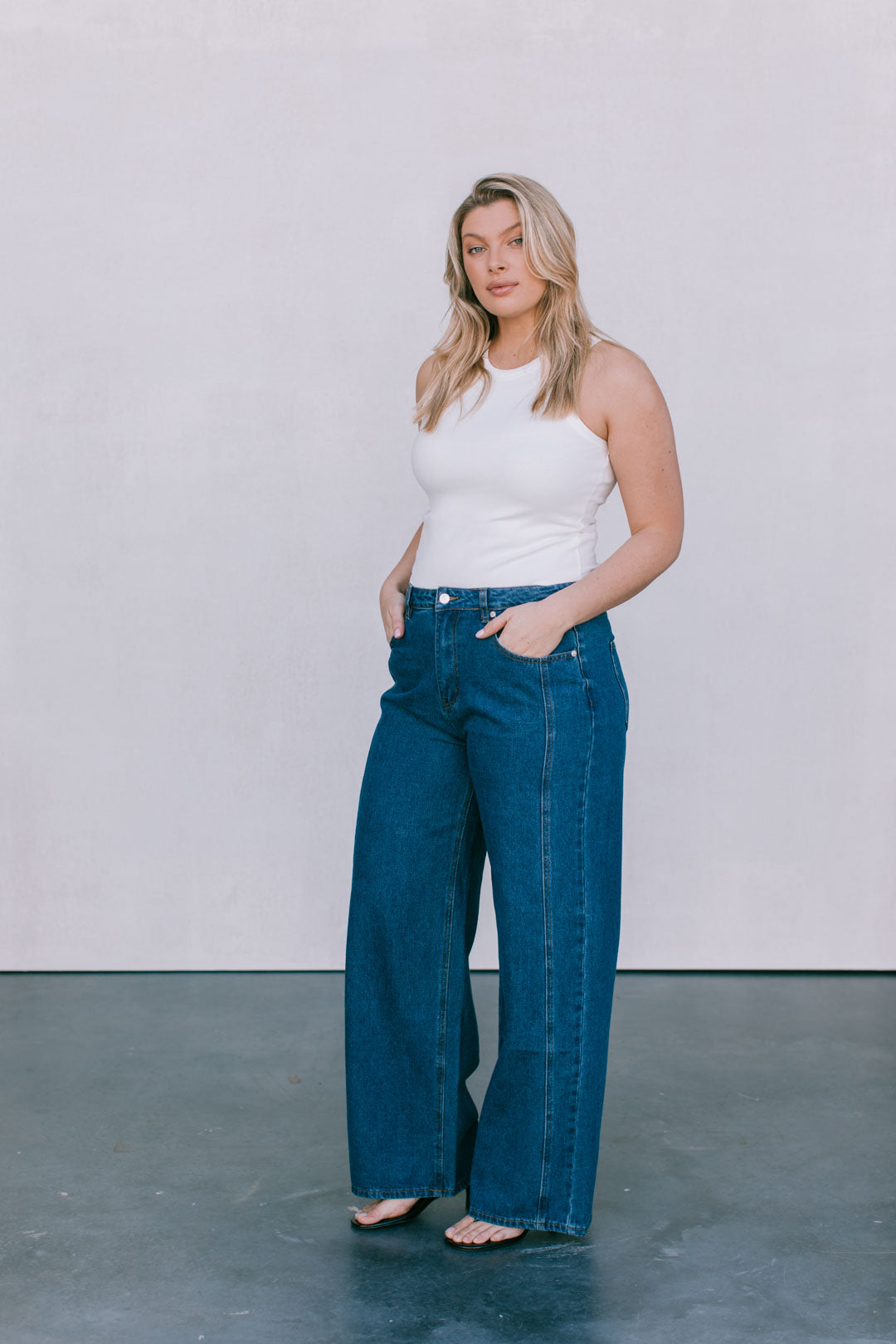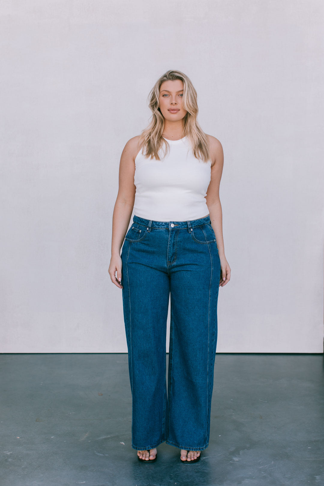 Ultra baggy, wide leg silhouette denim jeans. Premium, soft-feel cotton Dark Wash Blue denim.