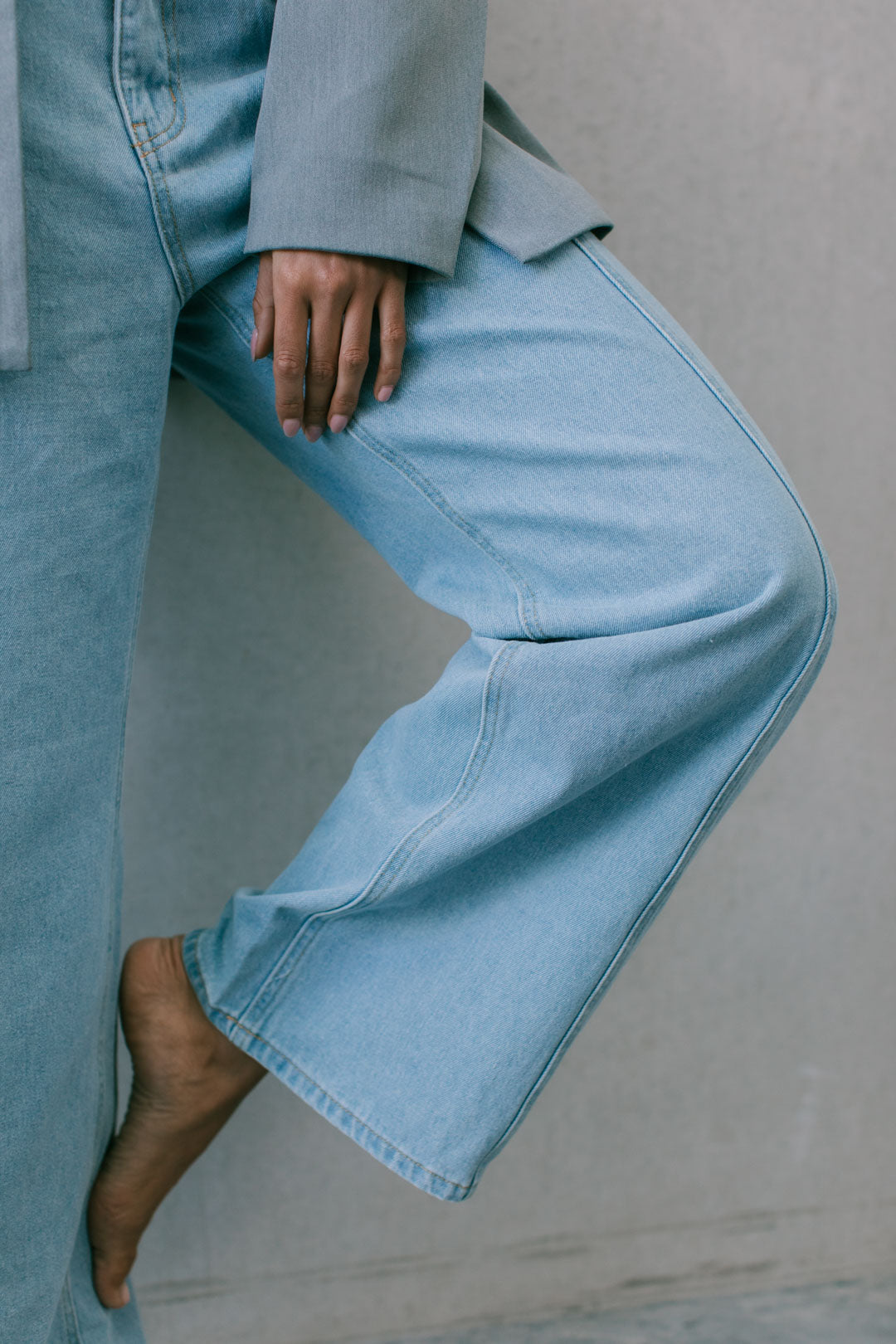 Low rise, ultra baggy wide-leg silhouette denim jeans. Premium, soft-feel cotton Light Wash Blue denim.