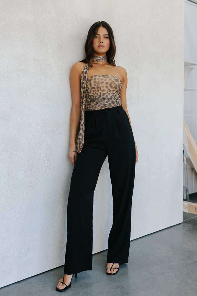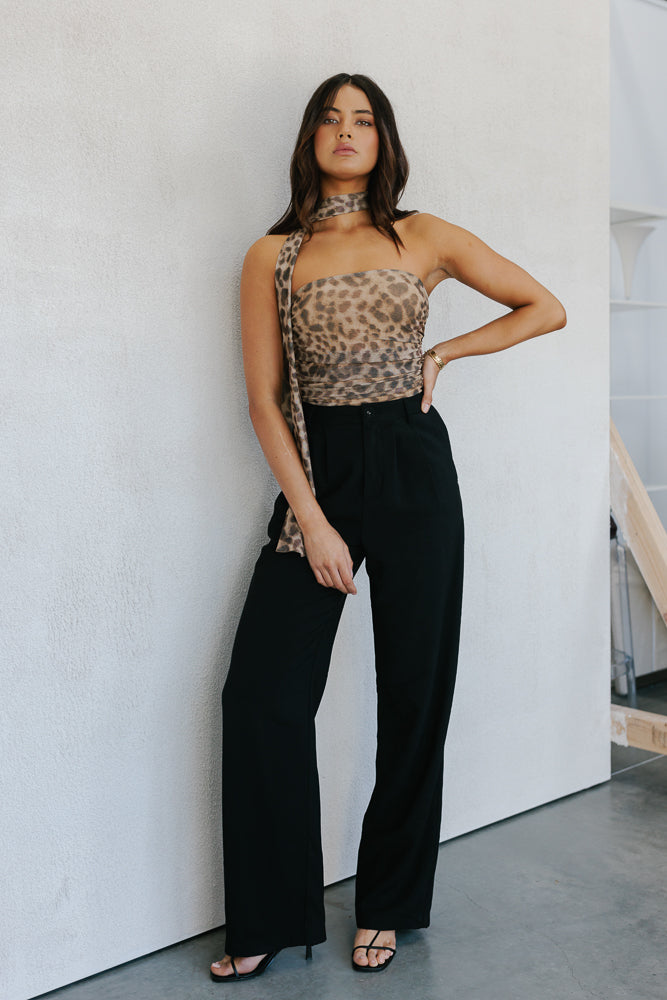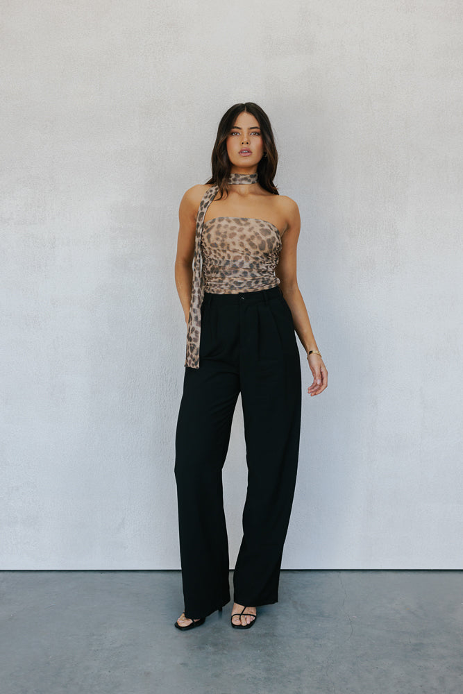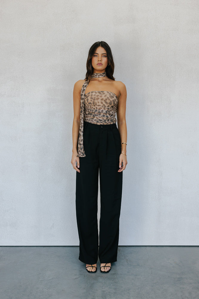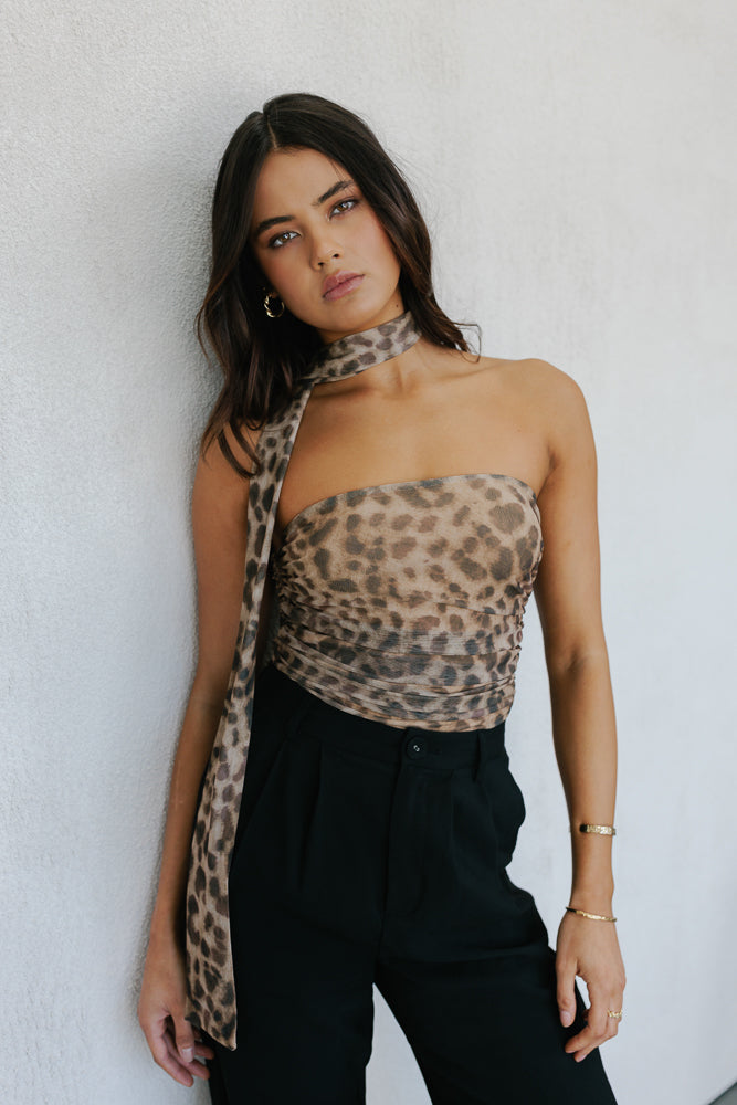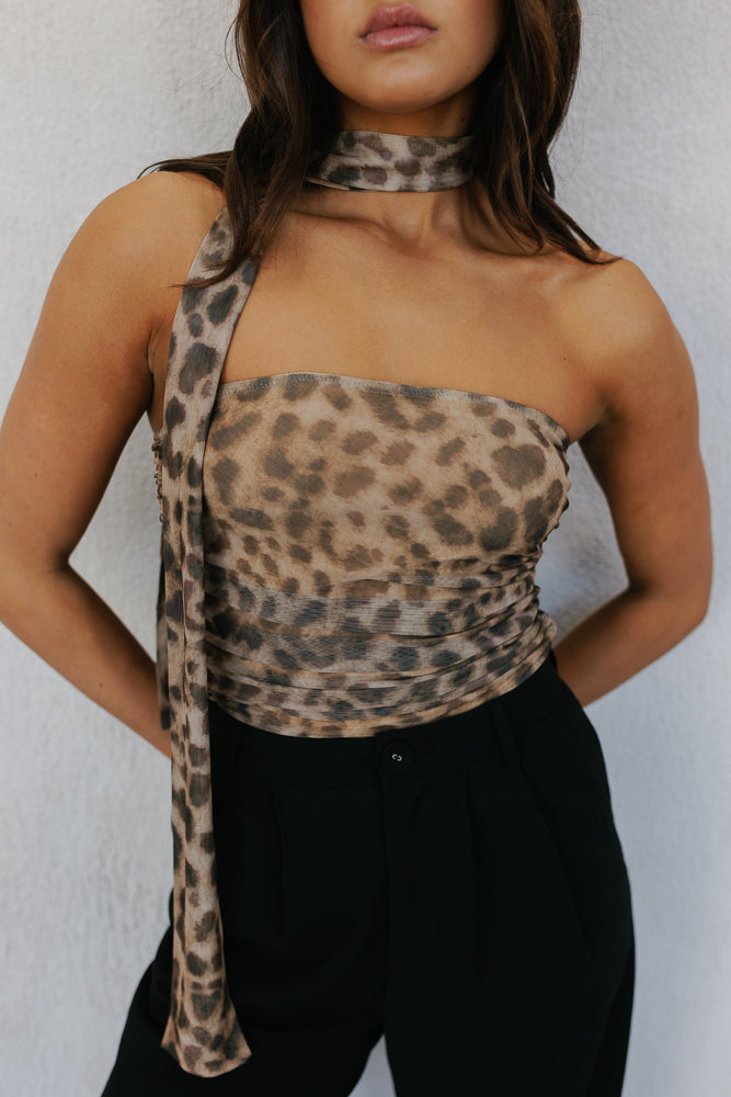 Meet our Jenny Top ~ a bold statement top + neck scarf designed to turn heads. A strapless silhouette in a standout leopard printed mesh, offers a fitted silhouette enhanced by ruching detailing. Jenny is perfect for making an impact.