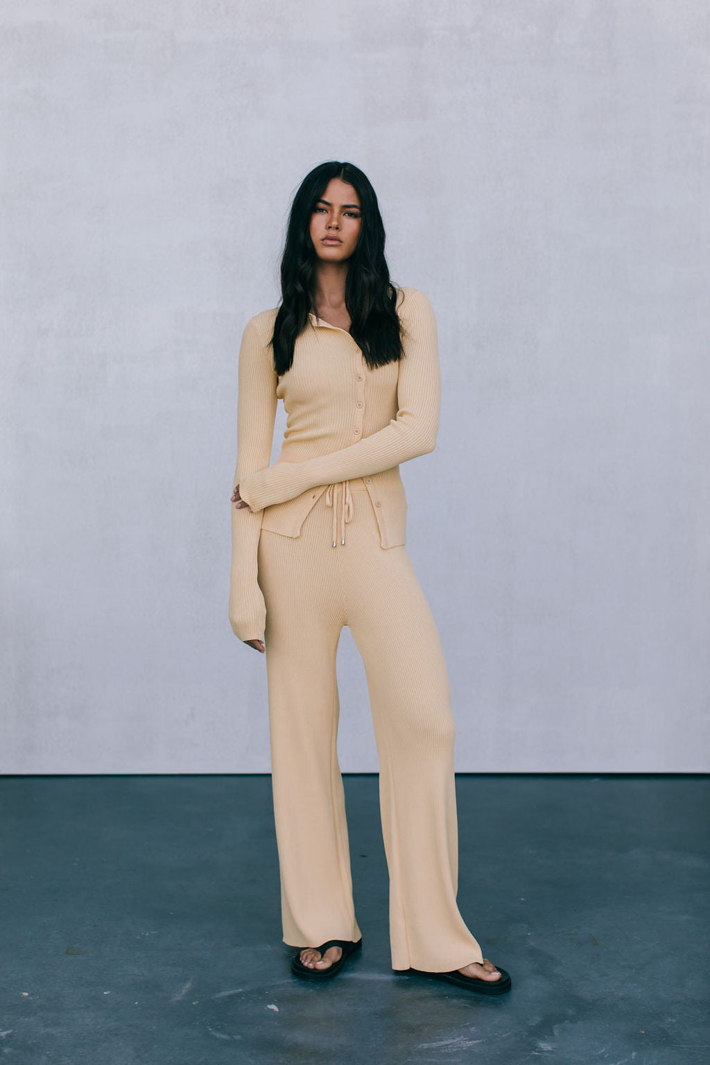 Step out in standout style in our Jolene Pants. These bold butter lemon ribbed knit pants for women, feature an ultra wide leg silhouette + adjustable waist tie with gold hardware. Blend comfort with effortless cool, perfect for dressing up or down.