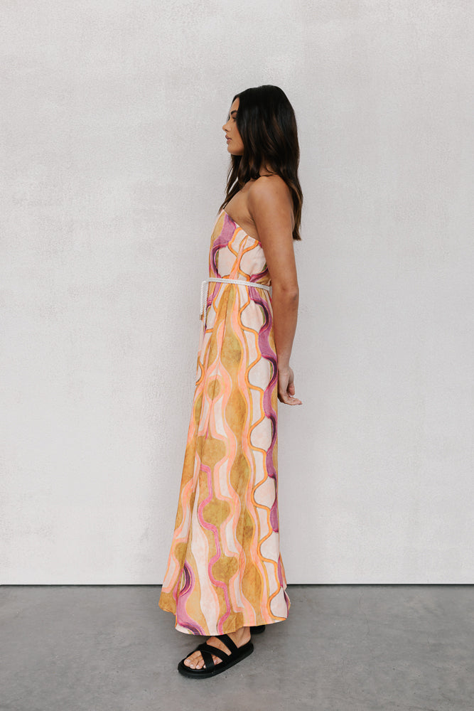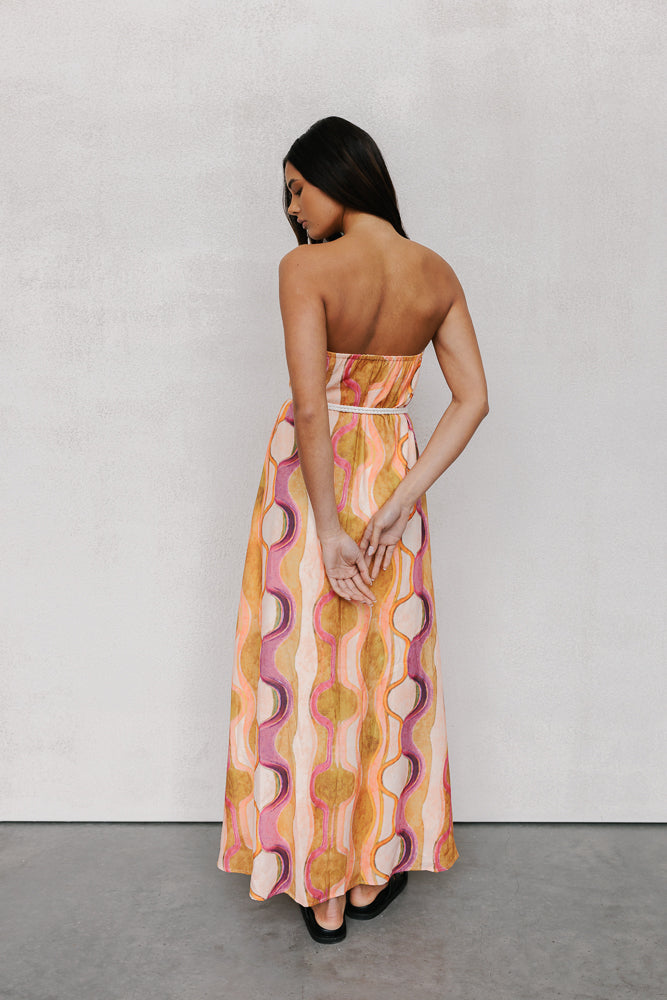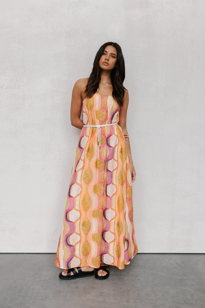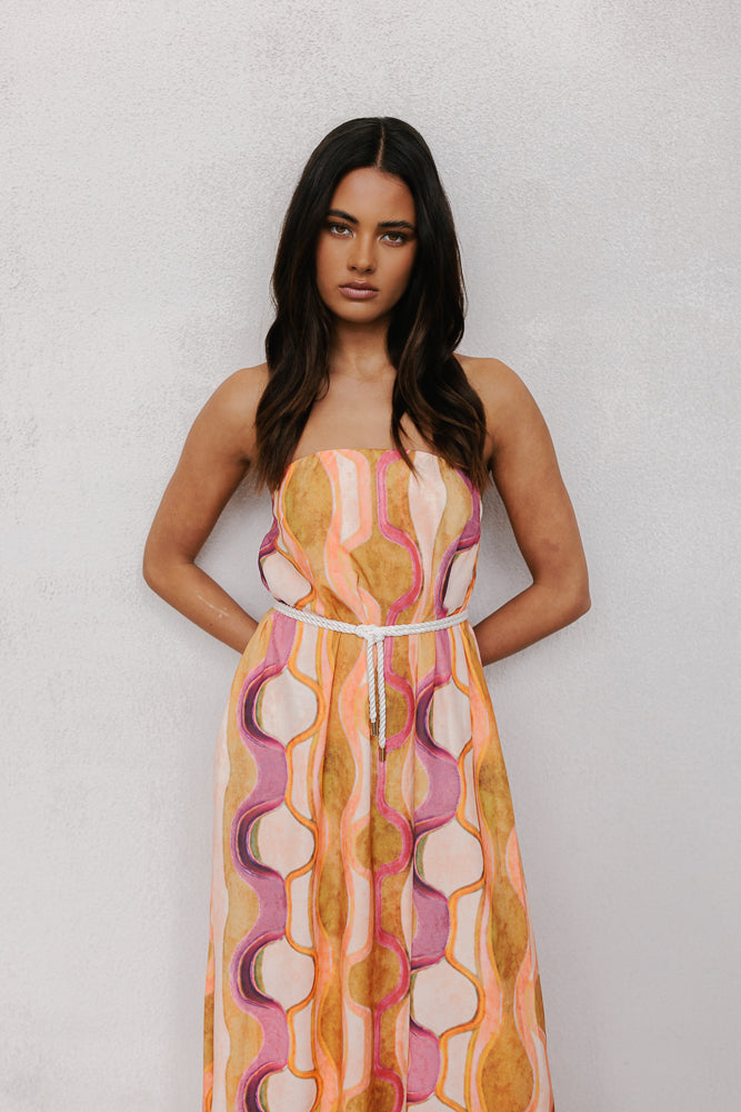 Our standout Kahlo Dress offers a chic, strapless design that combines style + comfort. Showcasing a bold water colour print + voluminous, a-line silhouette, she is perfect for making a statement at your next event.