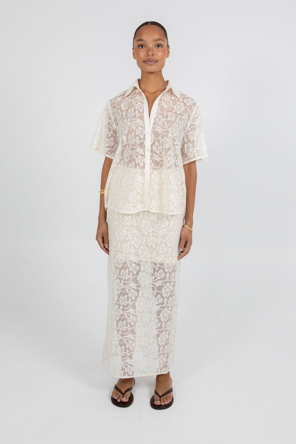 Our Kalisha Shirt combines elegance and comfort with sheer lace and delicate beige floral embroidery. Relaxed-fit with a classic collar and short sleeves, she delivers a chic, effortless look perfect for day to night styling