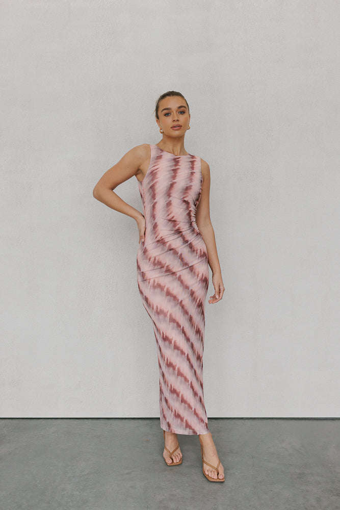 Make a statement in our Kayla Maxi Dress by Rosie - crafted in a pink, berry + lilac hued printed mesh. Her high neckline, flattering side ruching + a flattering fit offers the ultimate event-ready look.