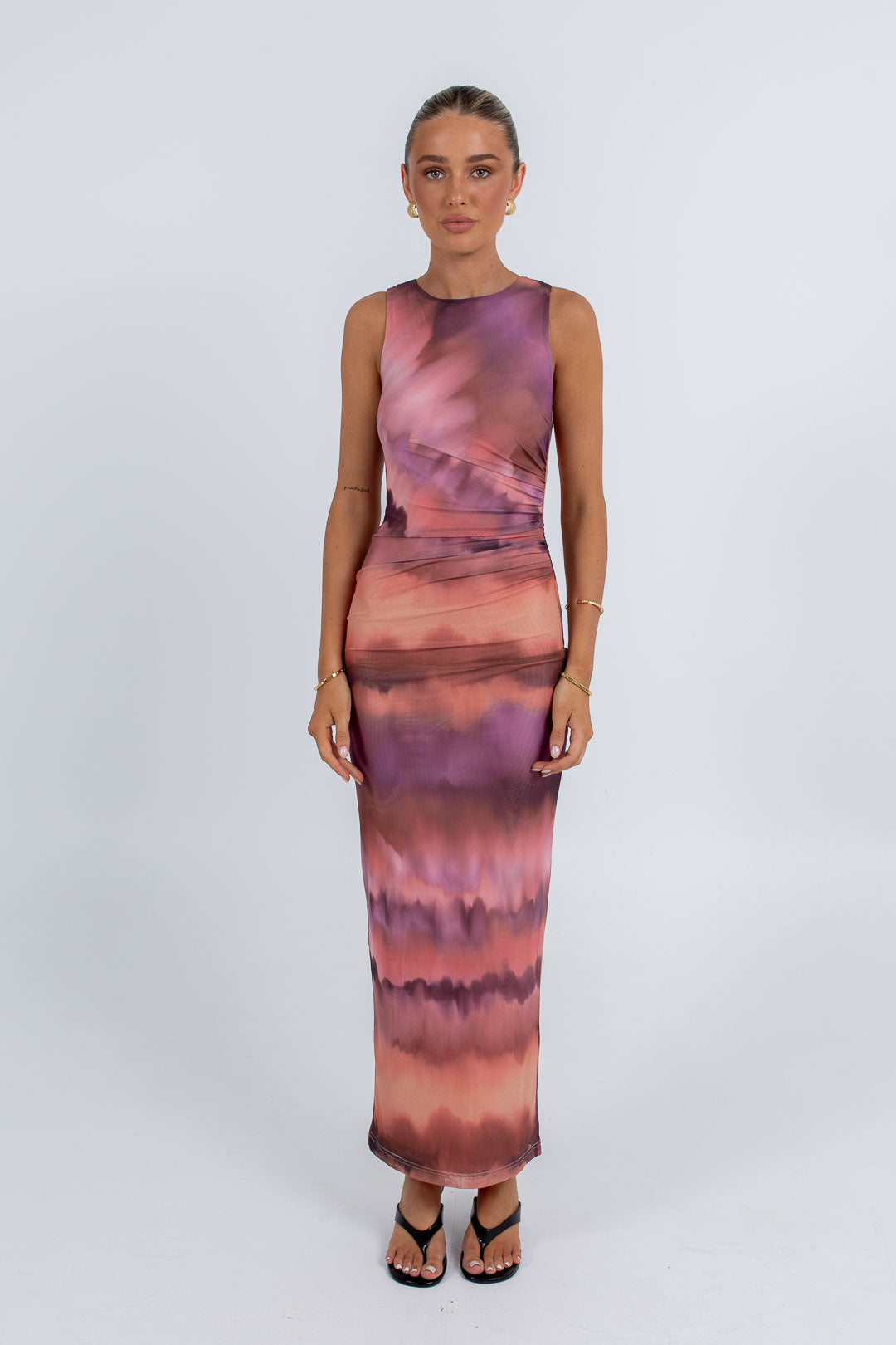 Make a statement in our Kayla Maxi Dress by Rosie - crafted in our trending desert haze print, a dreamy blend of purple, rust + peach tones. Her high neckline, flattering side ruching + a flattering fit offers the ultimate event-ready look.