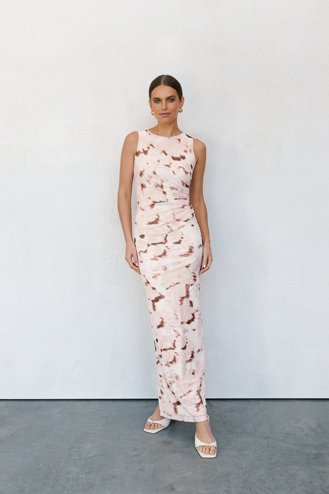 Feminine haze printed mesh maxi dress woman. Blend of soft pink, white + brown hues.
