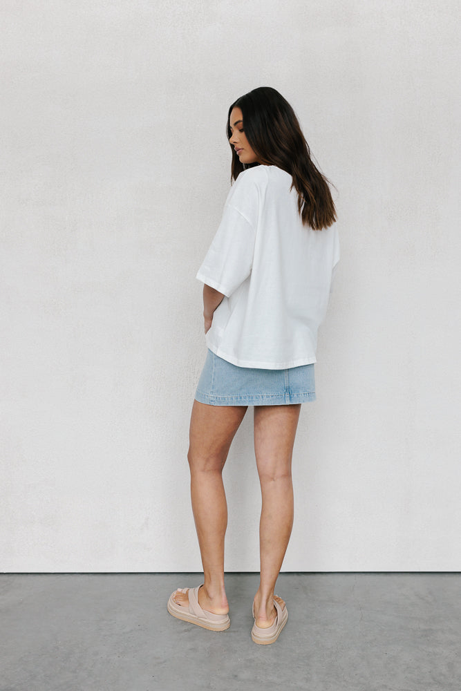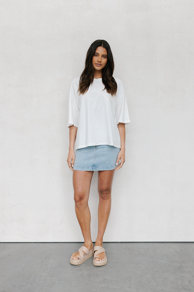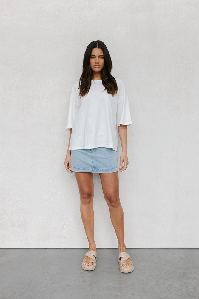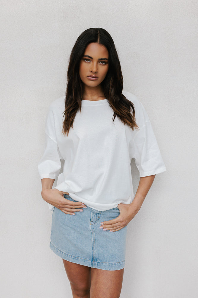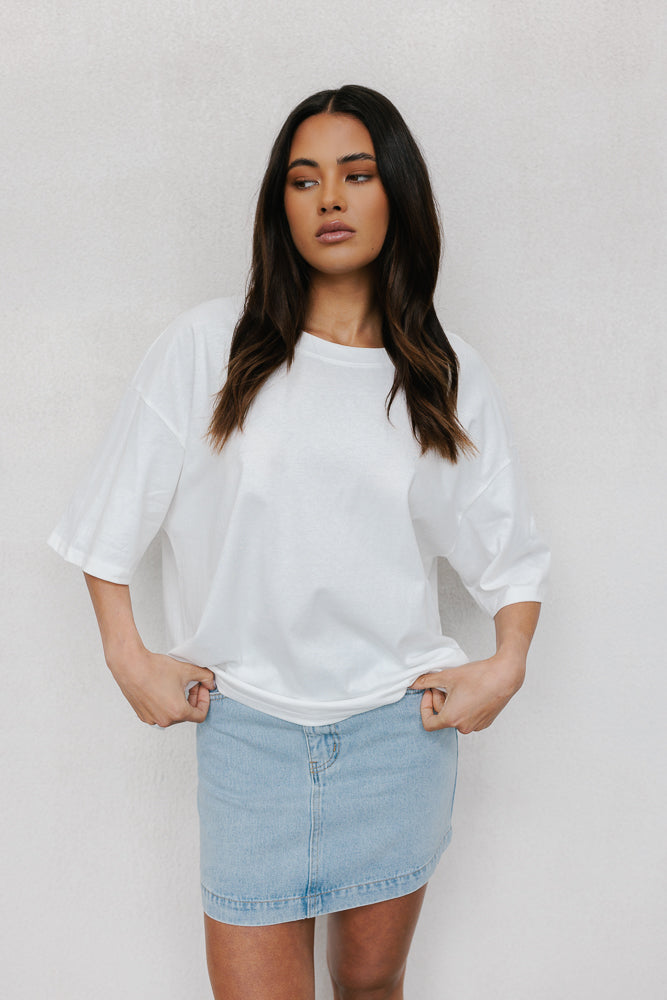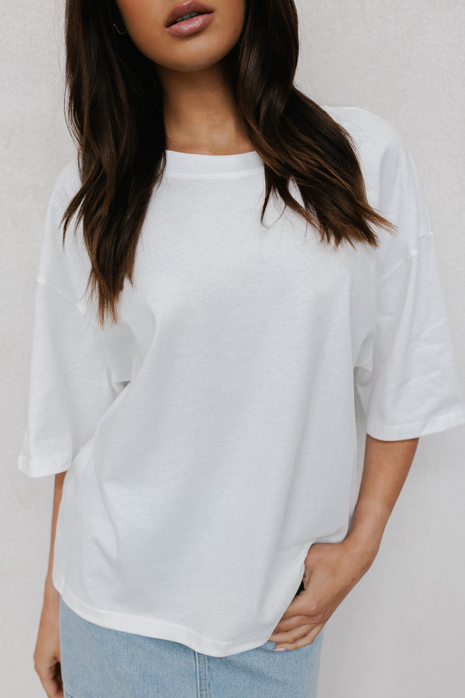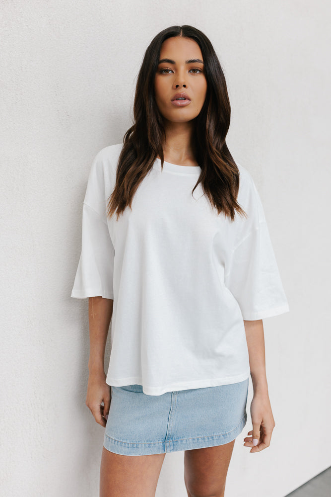 A classic everyday white tee, Larnie redefines casual comfort. Boasting a round neckline + relaxed silhouette with dropped shoulders for an effortlessly chic look. Her ultra boxy silhouette offers a comfy yet stylish fit.