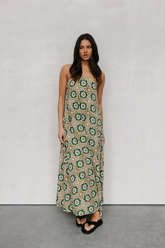 Geometrical khaki, green + beige tile printed linen blend maxi dress