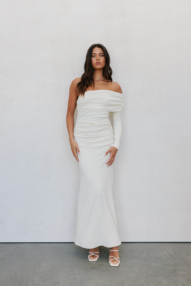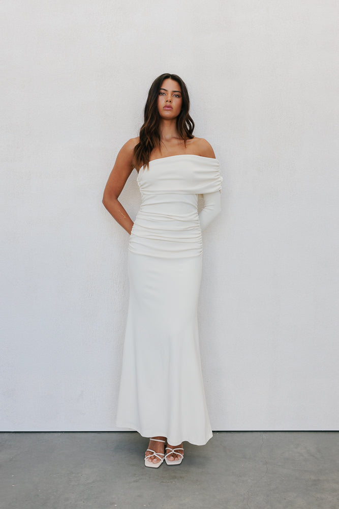 Make an unforgettable impression in our Lana Maxi Dress. This bone-hued maxi exudes classic elegance with a folded off-shoulder neckline + flattering a-line silhouette. Thoughtful ruching adds a touch of sophistication to this timeless design.