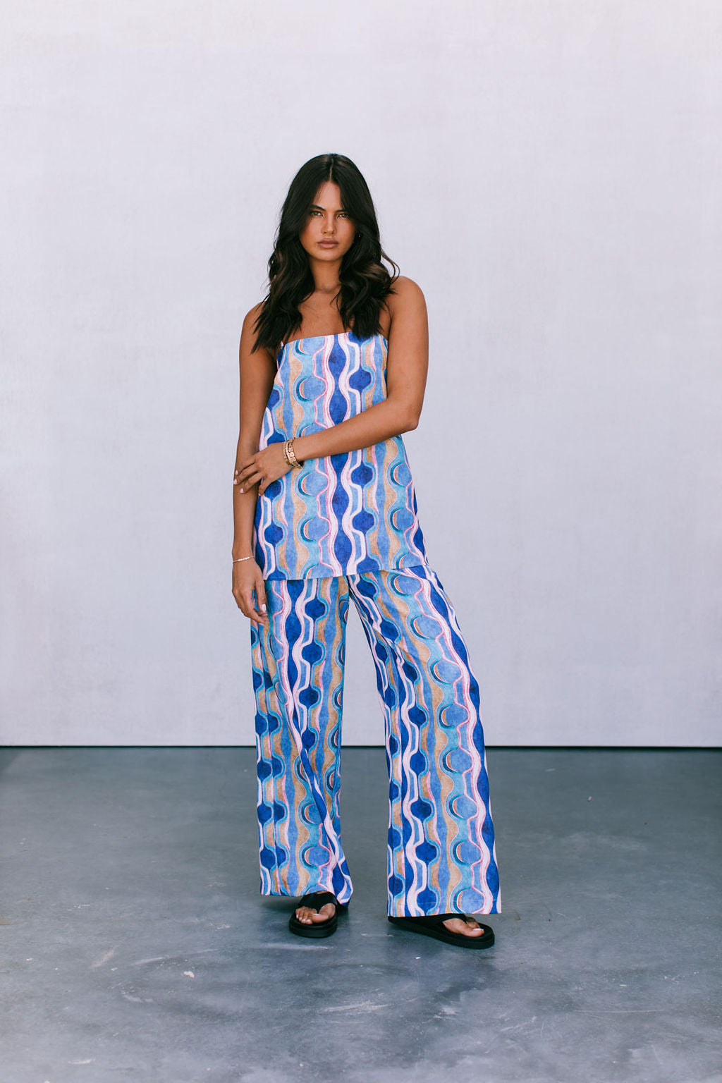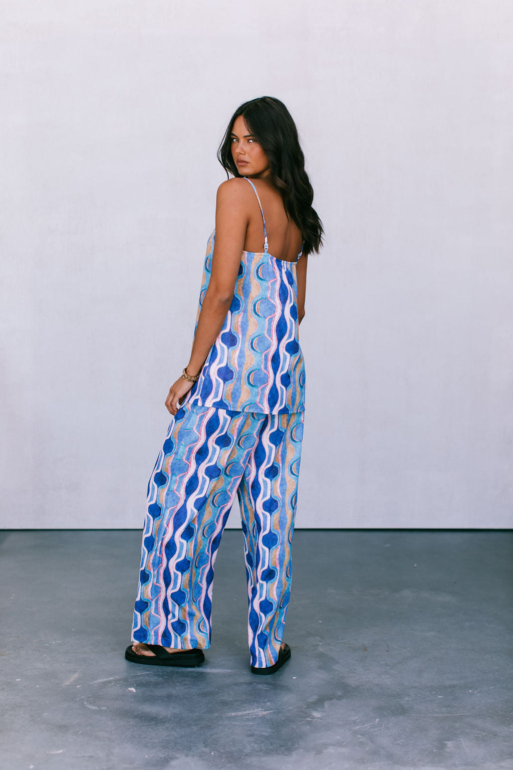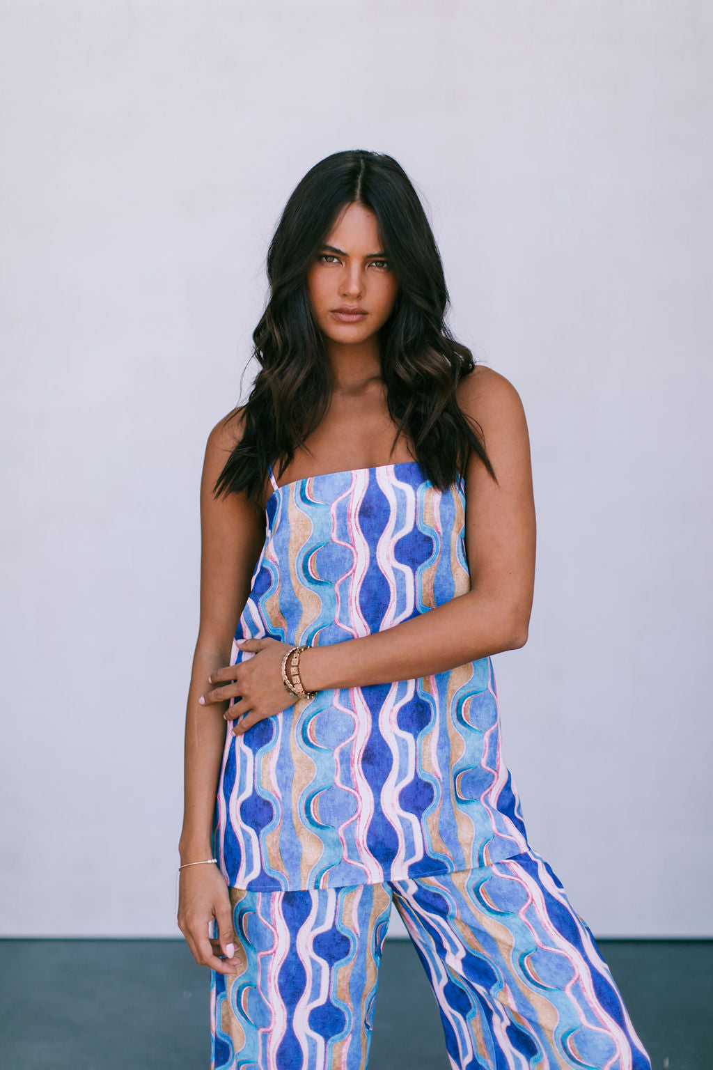 Our Larnia Singlet boasts a statement watercolour print in a bold blend of colours. Her straight silhouette + longer length offers a flattering, yet versatile fit. Style Larnia with matching Santorini Pants or Rhodes Skirt for the perfect pair.
