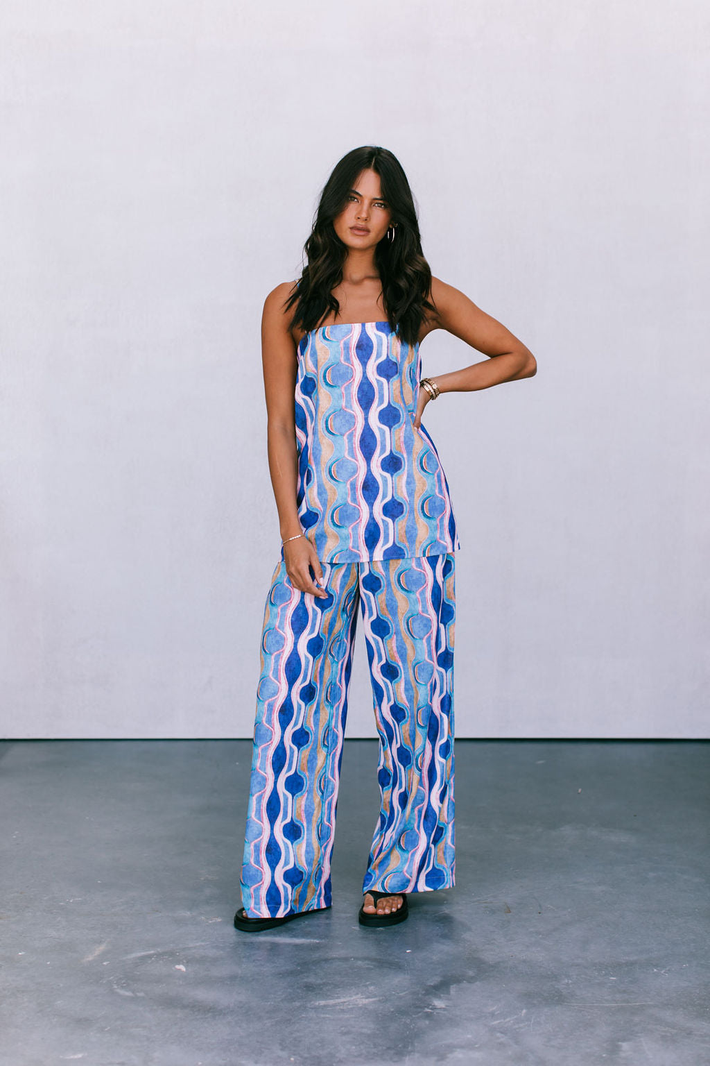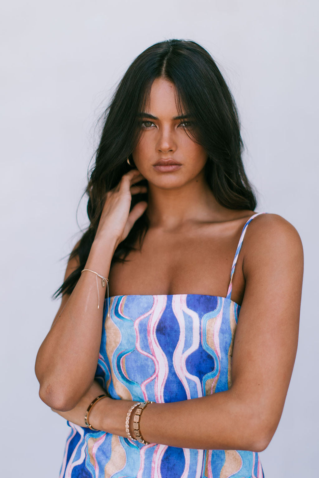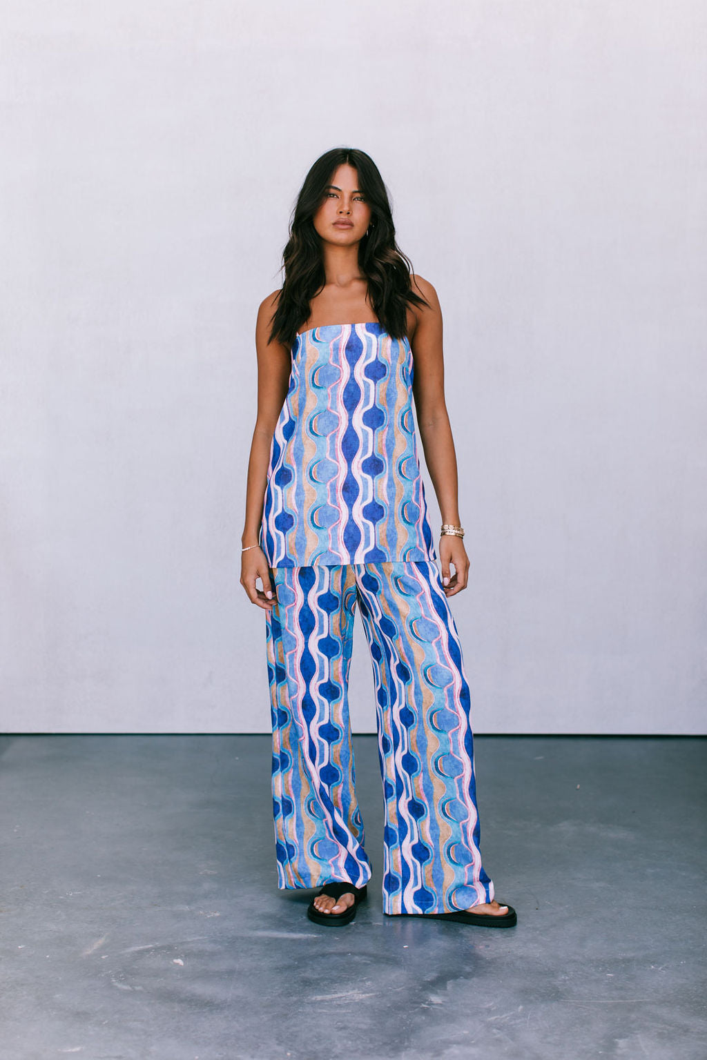 Our Larnia Singlet boasts a statement watercolour print in a bold blend of colours. Her straight silhouette + longer length offers a flattering, yet versatile fit. Style Larnia with matching Santorini Pants or Rhodes Skirt for the perfect pair.