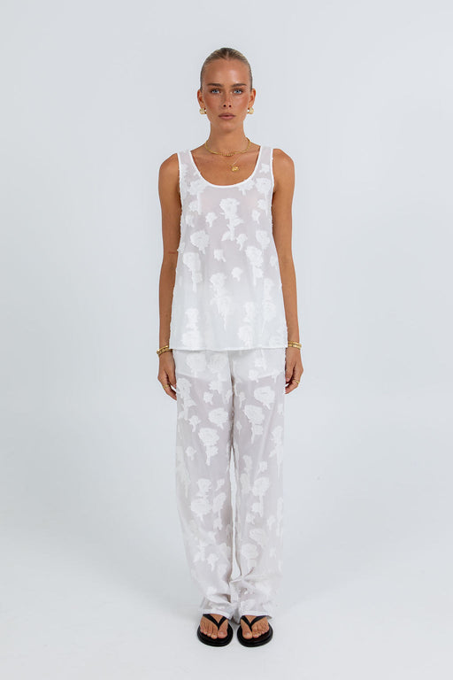 The Mirabel Singlet, exclusive to MMB, features white embroidered lace in a structured yet loose fit with sheer fabric. Effortlessly feminine and flirty, she’s perfect for layering or adding a delicate, romantic touch to any outfit.